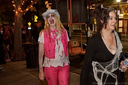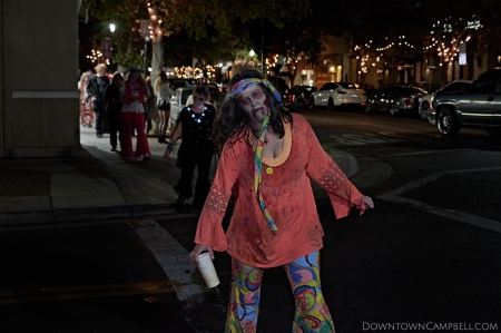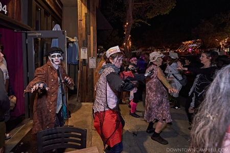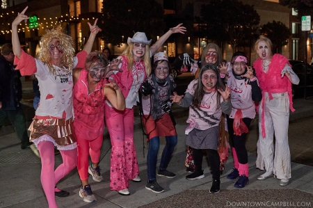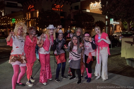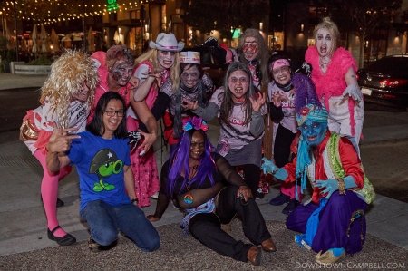 This annual tradition is the hard work of a Thrill the World dance team organized by Karen Stevens, owner of Adira Dance and Costume in San Jose. In addition to their appearance in Downtown Campbell for the evening Zombie Crawl, they also appear at other events throughout the day and then appear again in Downtown Campbell the following day for our Creepy Crawly Halloween street party. As much fun as it is, it's a huge commitment and a lot of effort on the part of everyone involved so we're very grateful to be invaded by zombies every year... well by these zombies.
