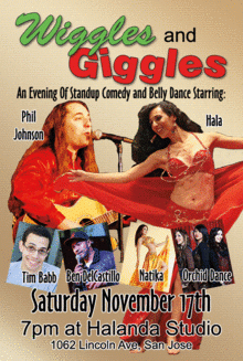Halanda Studio in Downtown Willow Glen is pleased to present a Wiggles & Giggles: A Bellydance & Comedy Show. We love to dance, we love to laugh. Well...how about both? Why choose one when you can have it all: bellydance and comedy in the same show! How often do you get that much fun in one place?