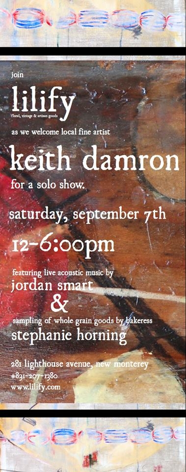 Lilify in New Monterey is pleased to welcome local fine artist Keith Damron for his first solo show on Saturday, September 7, 12pm-6pm. Keith’s multi-media abstract impressionist paintings, often created on out of ordinary canvas, offer visual and emotional depth. Come on down and check out his work!