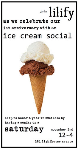 Lilify in New Monterey invites you to help us celebrate our first anniversary by having sundaes on Saturday! That's right, on November 2, 12pm-4pm we'll be holding an ice cream social in honor of our first year of business. Come on down and join us!