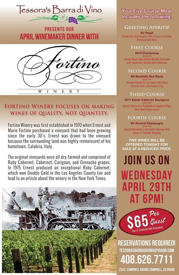 Fortino Winery will be at Tessora's Barra di Vino on April 29 at 6pm for our annual Winemaker Dinner. Fortino Winery, located in Gilroy, was established in 1970 when Ernest and Marie Fortino purchased a vineyard that had been growing since the early 30’s. Ernest was drawn to the vineyard because the surrounding land was highly reminiscent of his hometown, Calabria, Italy. Showcasing five of their amazing wines, four of them paired perfectly with a four course meal prepared by Chef Jenni.