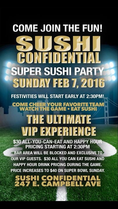 It's going to be a super weekend and Sushi Confidential is having a Super Sushi Party during the Super Bowl. Festivities start at 2:30pm. Price of admission gets you All You Can Eat Sushi and happy hour drink pricing. It's $30 in advance and $40 if you wait until Super Bowl Sunday.