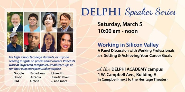 Delphi Academy presents the second event in the DELPHI Speaker Series for the 2015-16 school year, hosting seven Silicon Valley professionals in a panel discussion about career goals, paths, education and keys to success. The panelists bring insights from years of experience in a variety of companies, both large and small, as well as start-ups and entrepreneurial endeavors.
