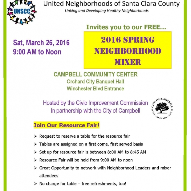 The UNSCC-United Neighborhoods of Santa Clara County welcomes you to its upcoming spring mixer and neighborhood resources fair this Saturday, March 26, 2016. This free mixer will be held at the Campbell Community Center’s Orchard City Banquet Hall from 9:00 AM to noon.