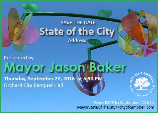 Save the Date! Mayor Baker has announced the State of the City Address is scheduled for Thursday, September 22 at 5:30 PM. The event will be held at Orchard City Banquet Hall at the Campbell Community Center. Please RSVP to attend this event by Thursday, September 15. RSVP’s can be sent to: MayorStateoftheCity@cityofcampbell.com. As in prior events, refreshments will be provided. Looking forward to seeing you there!