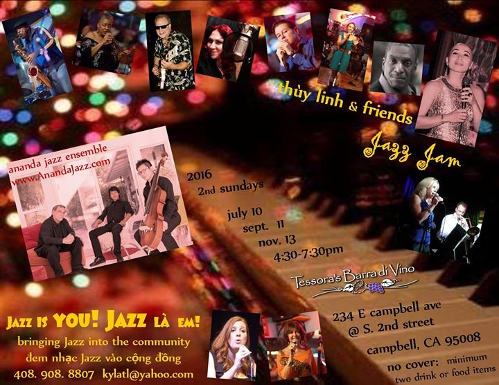 Our jazz jams continue bi-monthly at Tessora's through the end of 2016. The Jazz Jam is from 4:30pm to 7:30pm and features Thùy Linh with the Ananda Jazz Ensemble and various friends who join in each jam session.