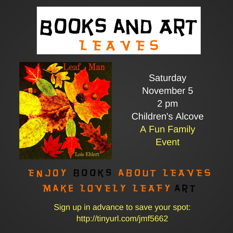 Children and their families are invited to make a lovely leafy art based on the book by Lois Ehlert, “Leaf Man.” All art supplies are provided and registration is required. In the Children’s Alcove.