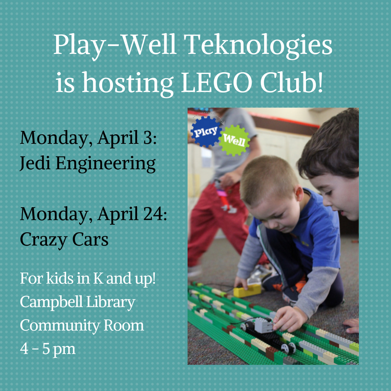 April 24: "Crazy Cars" Theme. We will build all kinds of different cars (e.g. motorized cars, pull-back cars, gravity cars and for older students steering cars). Once we are done with our cars we will work together to build a really long bridge. Play-Well Teknologies works with the Campbell Community Center and have been offering Lego Engineering classes in the Bay Area for 20 years.