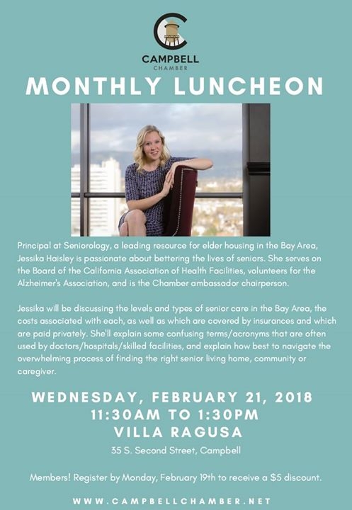 The Chamber monthly luncheon is a place to network, connect, socialize and learn. This month our keynote speaker is Jessika Haisley from Seniorology. She will discuss the various types and cost of senior care in the Bay Area as well as offer insights on finding the best living options for your loved ones.