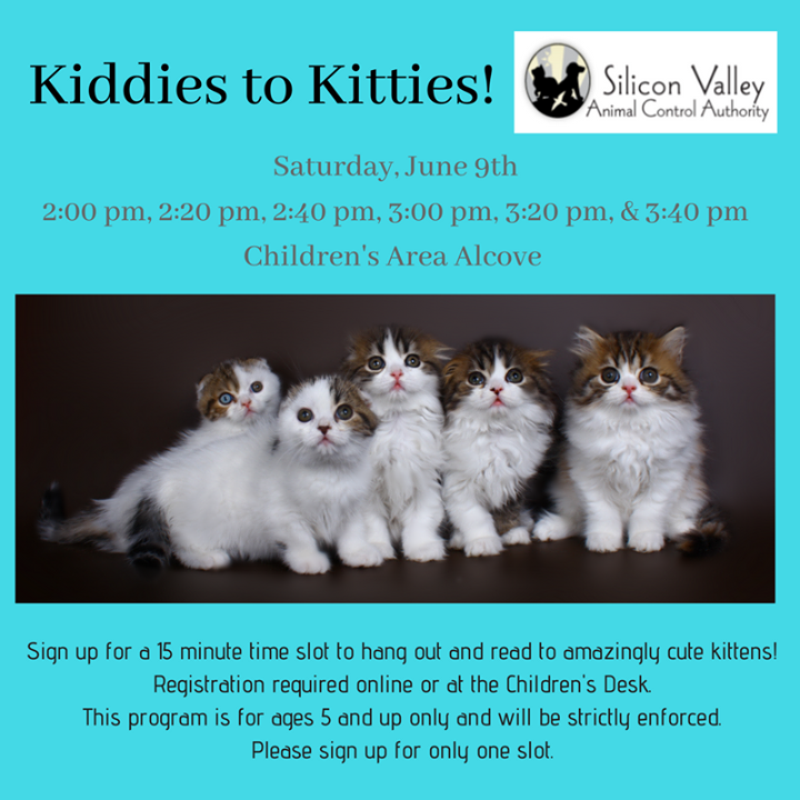 The Campbell Library is hosting "Kiddies to Kitties" in partnership with the Silicon Valley Animal Control Authority. Children ages 5 and up will get a fifteen minutes slot to read to an amazingly cute kitten. Registration is required online or at the Children's Desk.