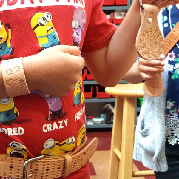 In this class, students can choose to create a kids' 1.25" belt, wristband, key fob, coin wallet, or bull. In the process of making two of these projects, students will learn basic leather skills including how to prepare leather, stamp designs and names, and add finishing touches.