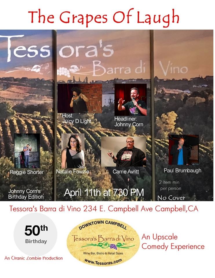 It's Johnny Corn's 50th Birthday so for April's Grapes of Laugh, he's going to be headlining the event and his friend Jucy D. Light will be taking over the hosting duties. Come celebrate Johnnys 50th by letting him entertain you along with his friends Reggie Shorter, Natalie Fowzie, Carrie Avritt, and Paul Brumbaugh!