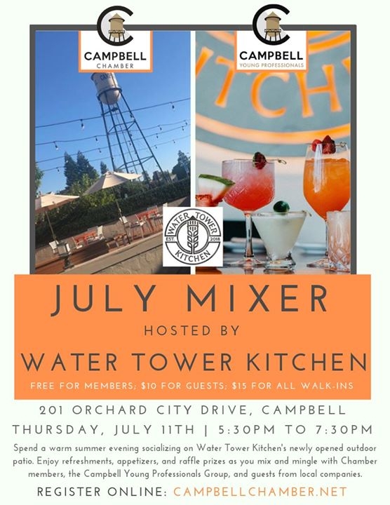 Spend a warm summer evening socializing on Water Tower Kitchen's newly opened outdoor patio. Enjoy refreshments, appetizers, and raffle prizes as you mix and mingle with Chamber members, the Campbell Young Professionals Group, and guests from local businesses.