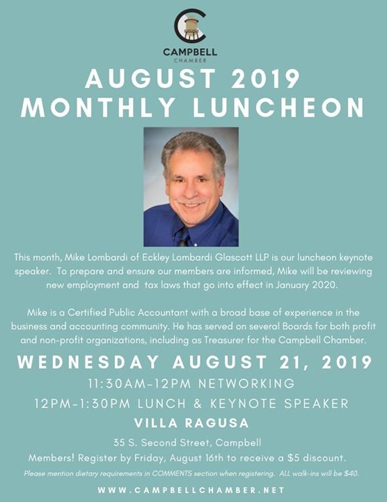 Mike Lombardi of Eckley Lombardi Glascott LLP is our keynote speaker. Mike will be sharing information about new employment and tax laws that go into effect in January 2020.