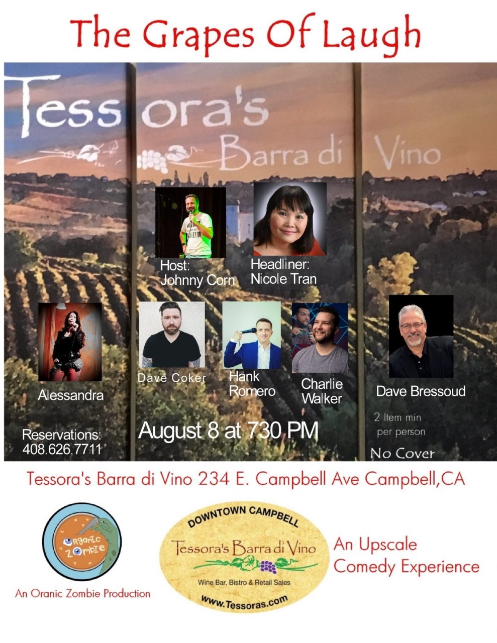 Join Tessora’s as we host our monthly live comedy show with Johnny Corn and his group of amazing comedians as they bring down the house. Nicole Tran headlines the August Grapes of Laugh show with Alessandra, Dave Coker, Hank Romero, Charlie Walker, and Dave Bressoud giving you even more reasons to laugh out loud.