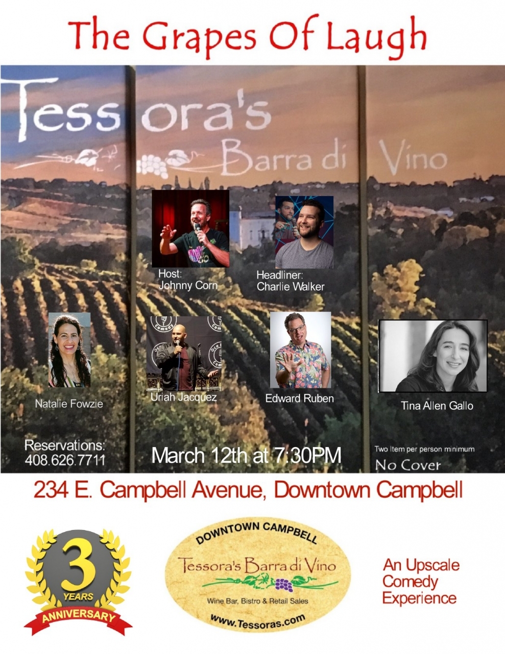Join Tessora’s as we host our monthly live comedy show with Johnny Corn and his group of amazing comedians as they bring down the house. Charlie Walker headlines with Natalie Fowzie, uriah Jacquez, Edward Ruben, Tina Allen Gallo, and Johnny Corn supporting.