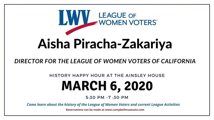 Aisha Piracha-Zakariya from the League of Women Voters of California will be discussing the history of the League in celebration of the 100th Anniversary of women’s right to vote and detail current activities of the League such as the 2020 Census.