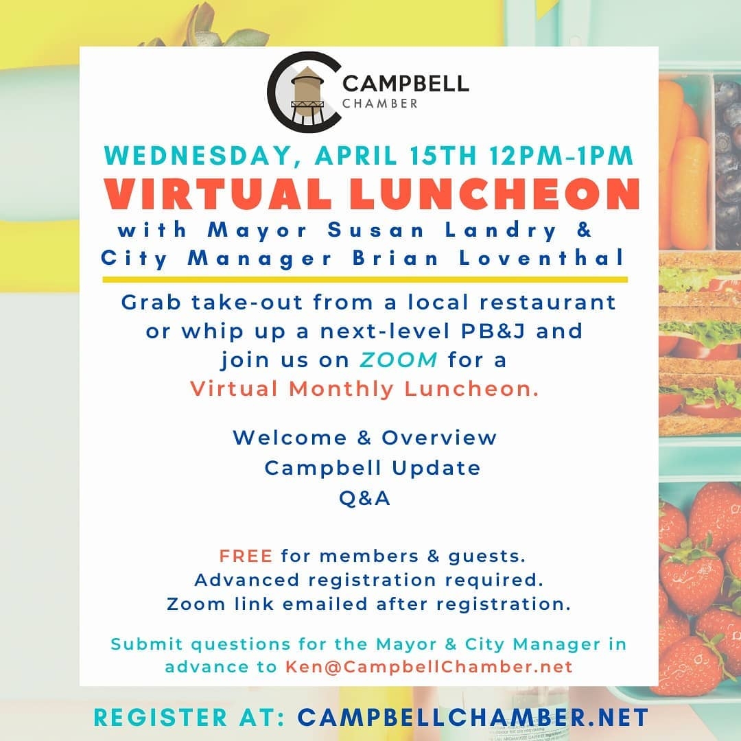 Grab take-out from your favorite local restaurant or whip up a next-level PB&J and join us on ZOOM for a Virtual Monthly Luncheon with Mayor Susan Landry and City Manager Brian Loventhal. Overview Campbell Update Question & Answer session This event is FREE for members & guests.