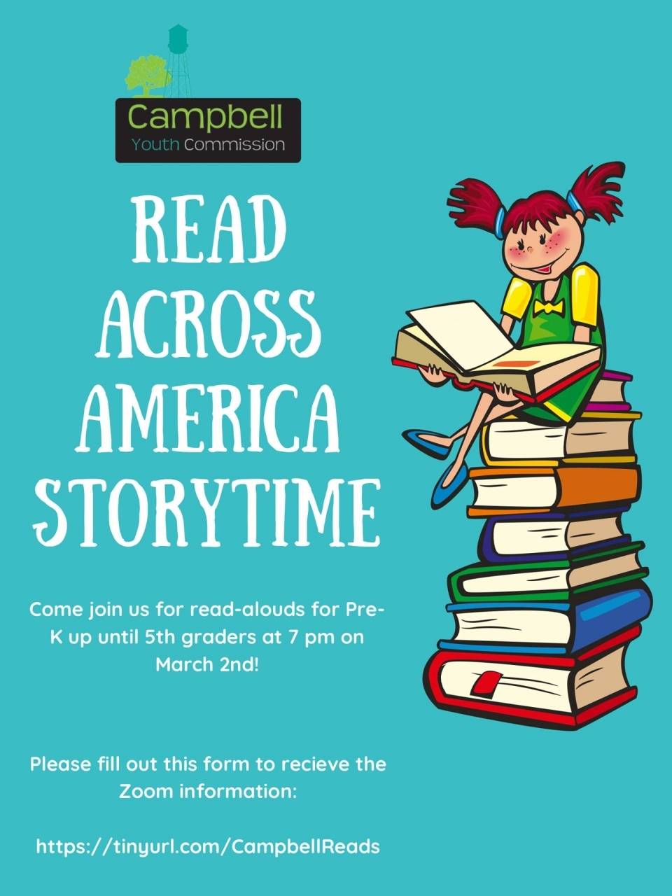 The Campbell Youth Commission is hosting a read-aloud session in honor of Read Across America Day for Pre-K through 5th graders on March 2nd at 7pm. The participants will be split into breakout rooms, and the Commissioners will be reading them a story. We would love to see you there! Please fill out this form for the zoom link: https://tinyurl.com/CampbellReads.