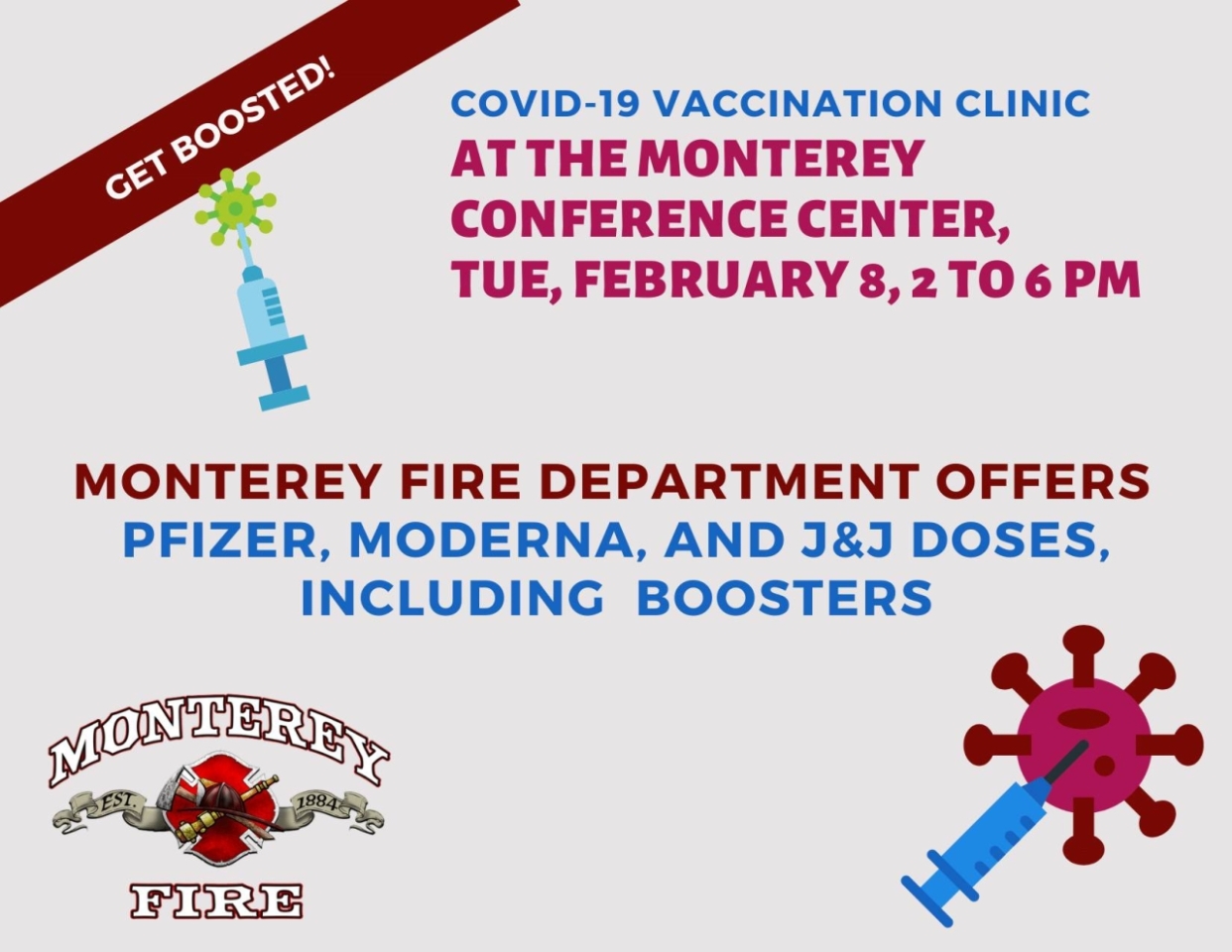 Monterey Fire Department is hosting a free Covid-19 vaccination clinic for ages 12+ at Monterey Conference Center on Tuesday, February 8, 2pm-6pm. The clinic will have all three vaccines available (Pfizer, Moderna, J&J) and can administer first, second, and booster doses as needed. Walk-ins are welcome, or you can register online here.