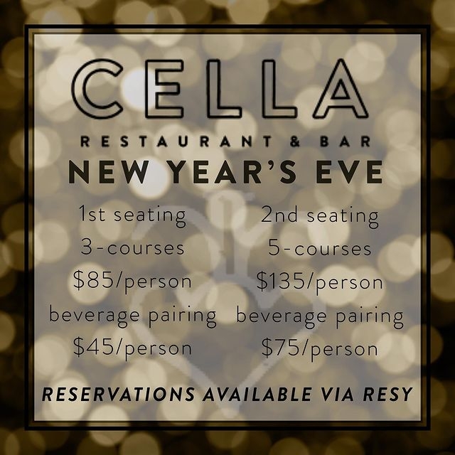 Cella Restaurant and Bar invites you to join us for dinner on New Year’s Eve. Two seatings will be offered with optional wine and cocktail pairings.