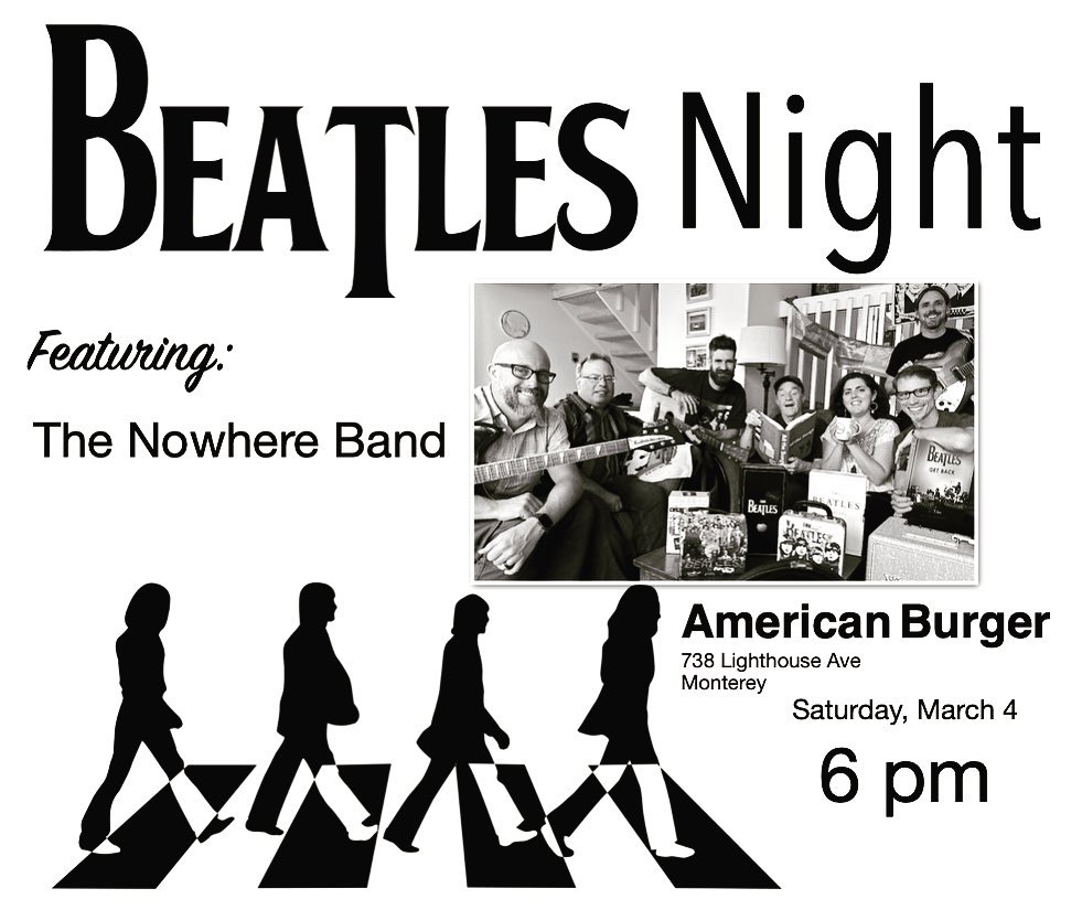 American Burger presents Beatles Night featuring the Monterey Peninsula's own Nowhere Band on Saturday, March 4 at 6pm. This will be a great show for the whole family!