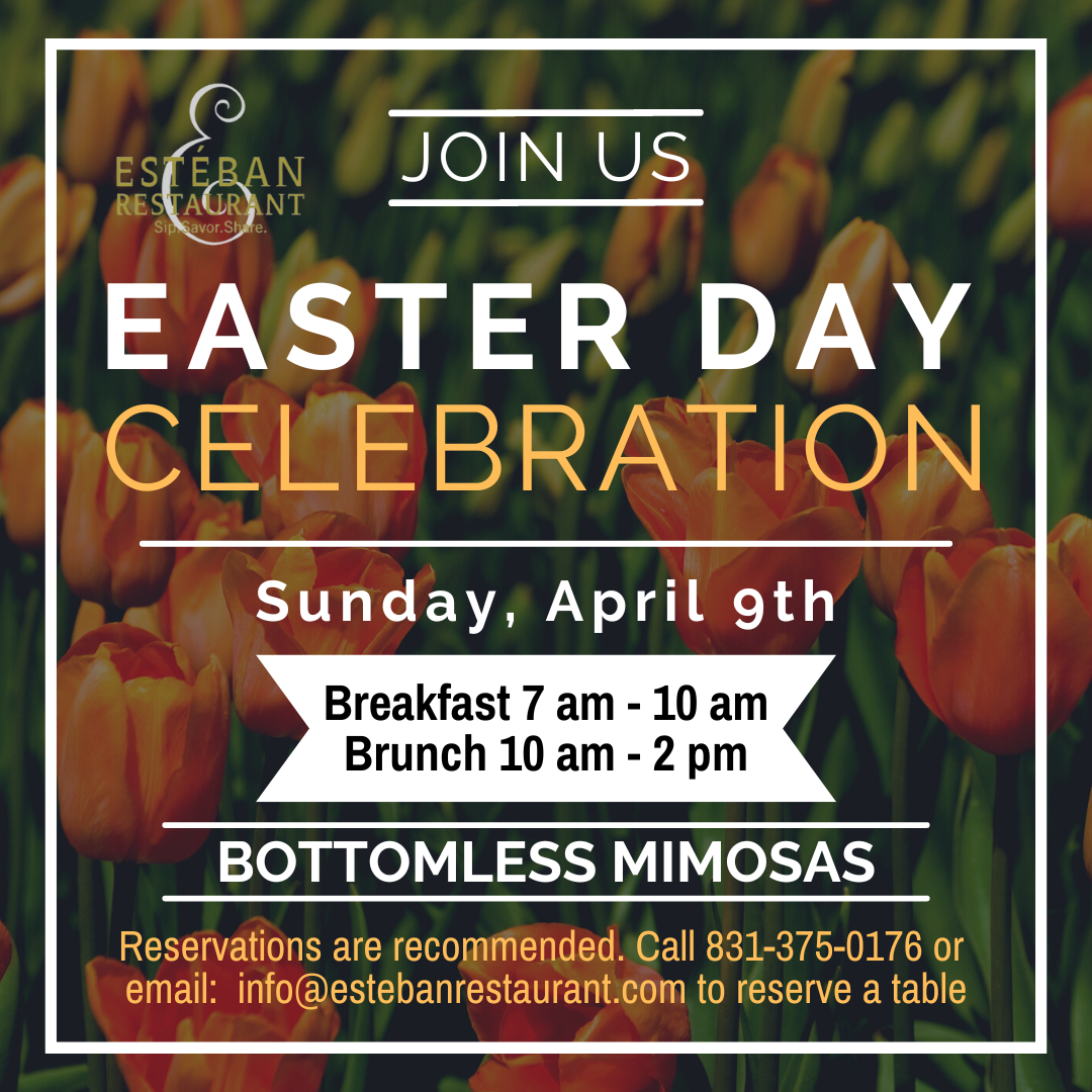 Savor the bounty of spring this Easter at Esteban Restaurant on Sunday, April 9. We'll serve our regular breakfast menu 7am-10am and our special brunch menu 10am-2pm. Reservations are recommended - please phone 831-375-0176.
