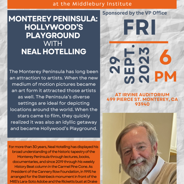 The Vice President's Office at the Middlebury Institute of International Studies presents a talk by Neal Hotelling entitled Monterey Peninsula: Hollywood's Playground on Friday, September 29, 6pm-8pm at Irvine Auditorium. This event is free and open to the public.