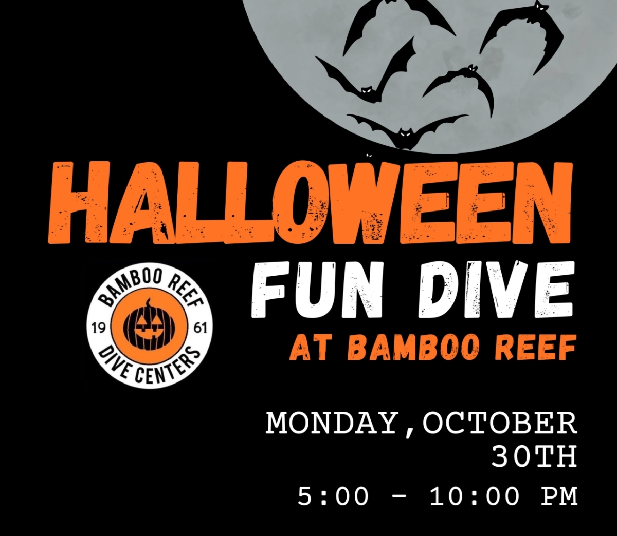 Join Bamboo Reef Dive Shop for a Halloween-themed nighttime beach dive with underwater pumpkin carving! Fee is $35; bring your own pumpkin. Space is limited so register online to reserve your spot.
