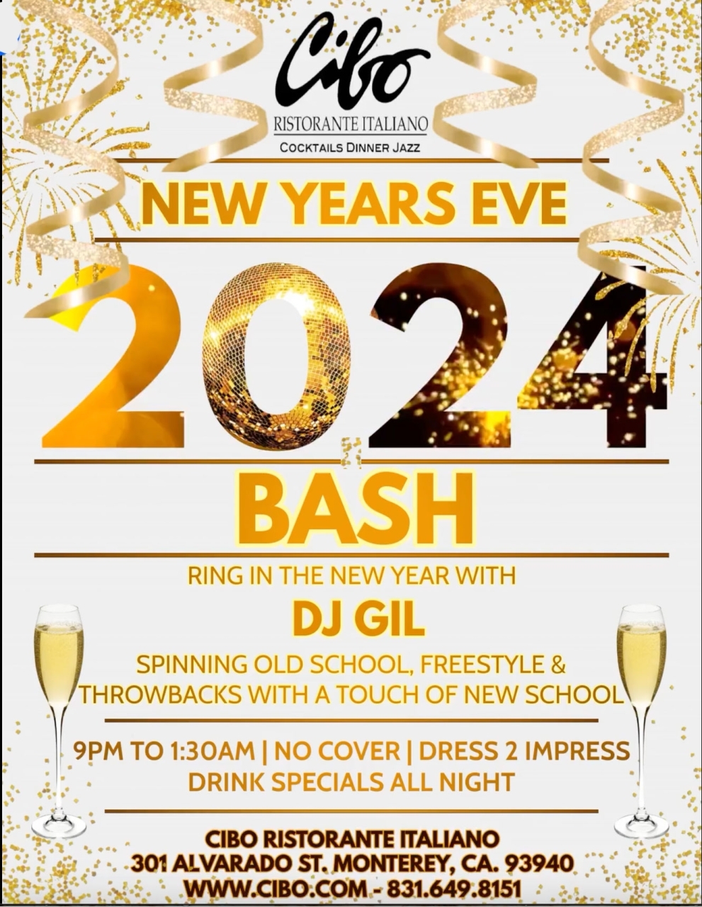 Cibo Ristorante Italiano invites you to join us for our annual New Year's Eve Bash! We'll be celebrating 9pm-1:30am, no cover charge. Come ring in the new year with DJ Gil! Dress to impress. We'll have drink specials all night.