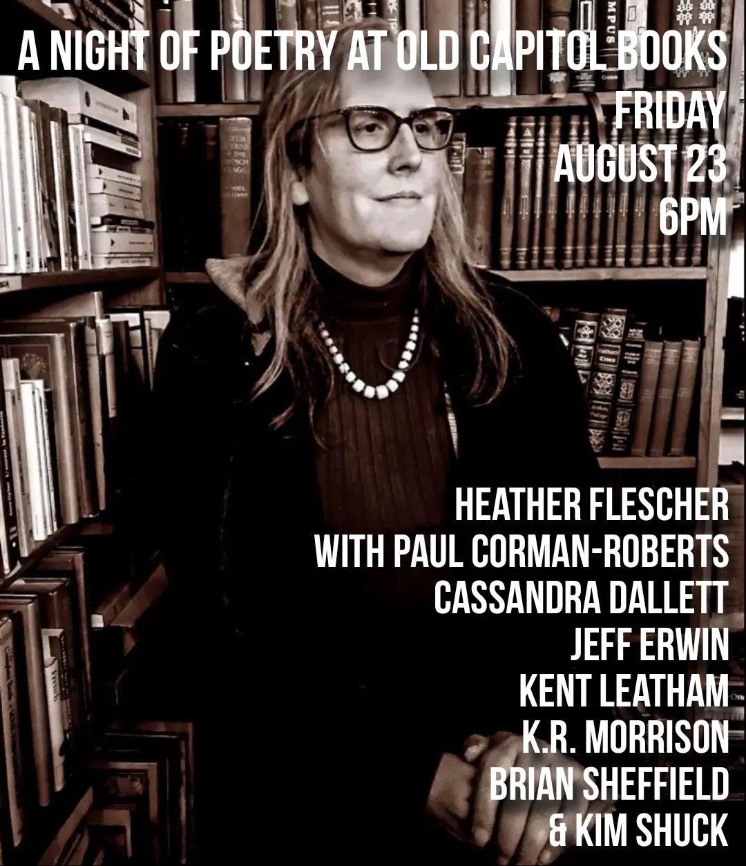 Old Capitol Books presents a night of poetry to celebrate the publication of a new chapbook by local poet Heather Flescher on Friday, August 23 at 6pm.