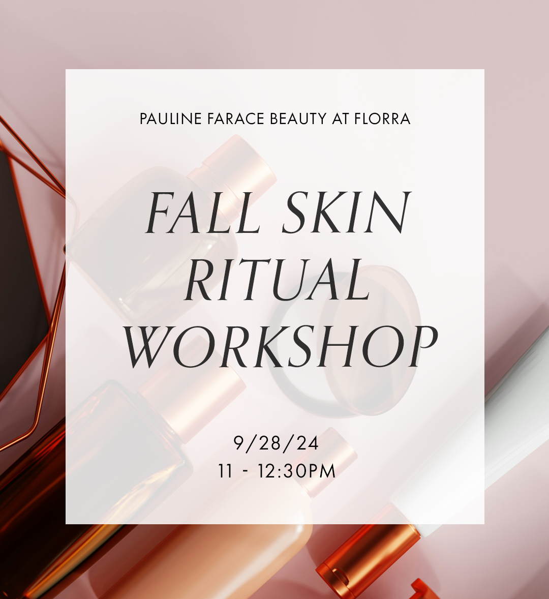 Get ready for Fall by nourishing your skin during the changing seasons. Turn your everyday skincare routine into mini am & pm skincare rituals. Licensed Esthetician Pauline Farace will answer all your skincare questions & teach you how to layer & cocktail products for your own personal glow.