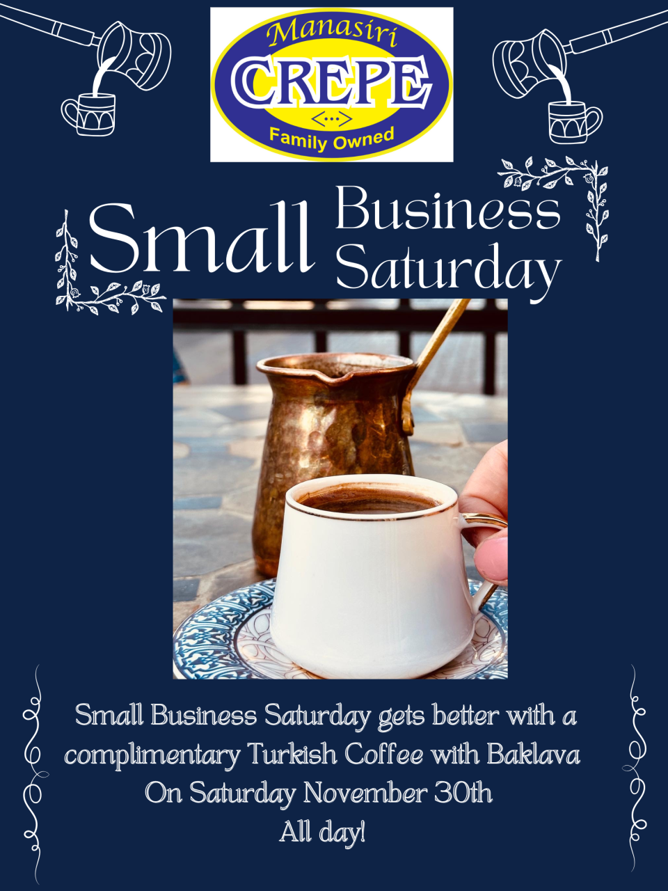 Manasiri's Crepes and Sandwiches is serving a complimentary Turkish coffee with baklava to guests all day on Small Business Saturday, November 30.