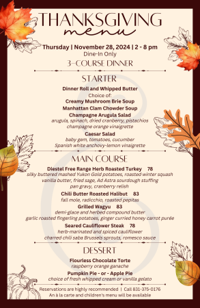 Guests can also choose a la carte dishes from a Thanksgiving special menu, featuring our California-inspired Spanish cuisine. A children's menu will be available.