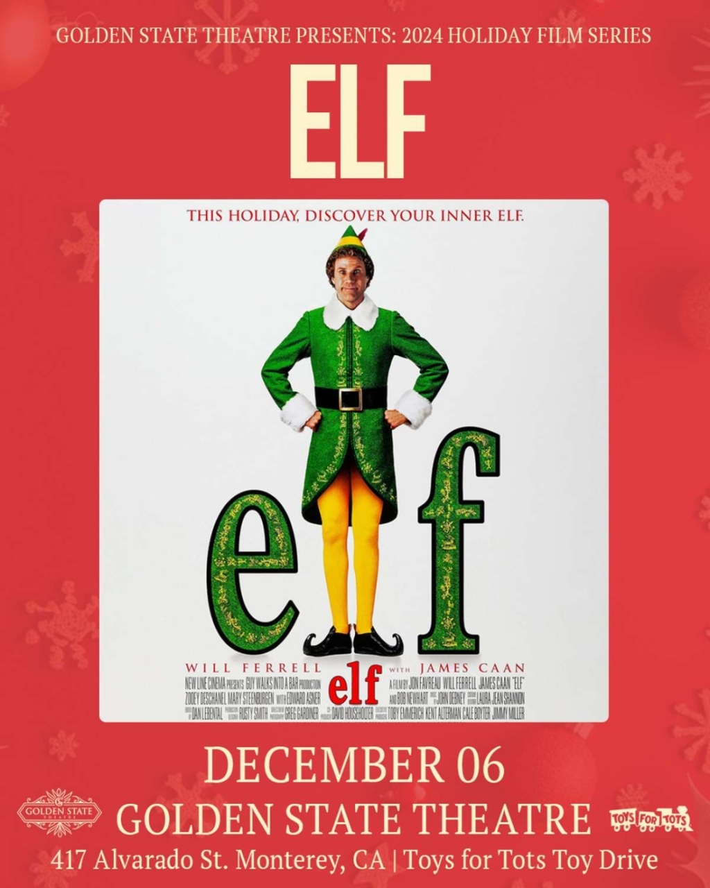 Golden State Theatre invites you to join us for a night of family fun on Friday, December 6 as we screen Elf (2003) starring Will Farrell. Doors open 5:30pm, film starts at 6pm.