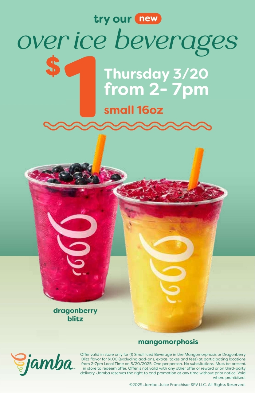 Jamba in Downtown Old Monterey invites you to try our new over ice beverages for only $1 for a 16 oz. cup on Thursday, March 20, 2pm-7pm.