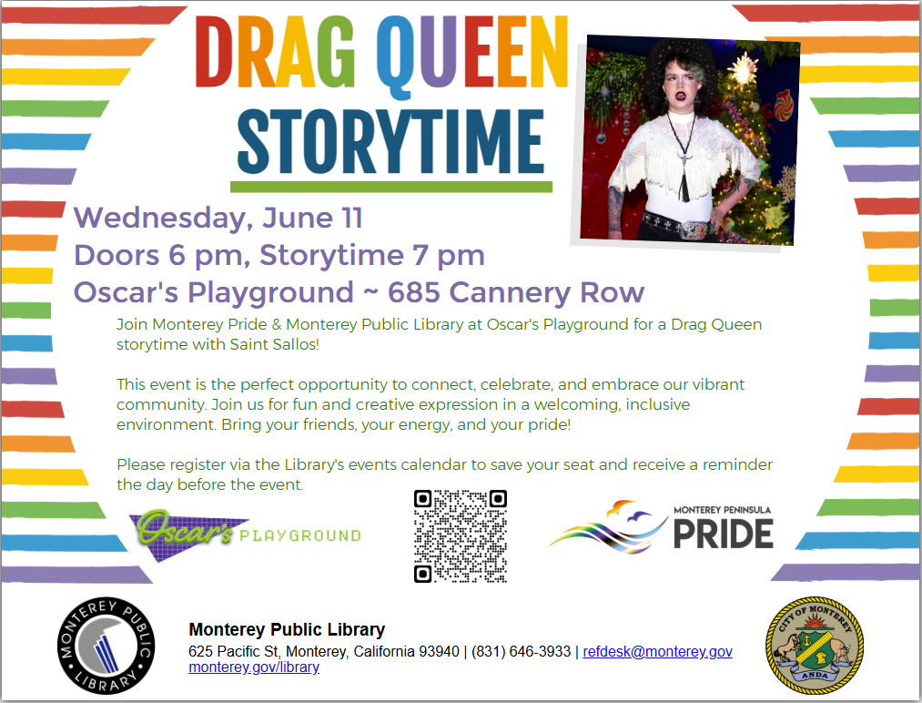 Join Monterey Peninsula Pride & Monterey Public Library at Oscar's Playground for a free Drag Queen Storytime for all ages with Saint Sallos on Wednesday, June 11. Doors open at 6pm, storytime begins at 7pm. Join us for fun and creative expression in a welcoming, inclusive environment.