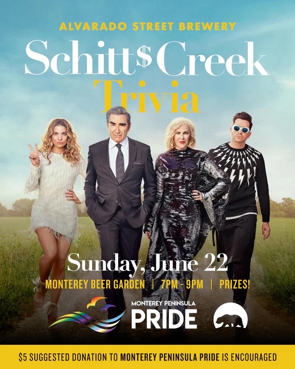 Alvarado Street Brewery is holding a Schitt's Creek Trivia Night in the beer garden on Sunday, June 22, 7pm-9pm!