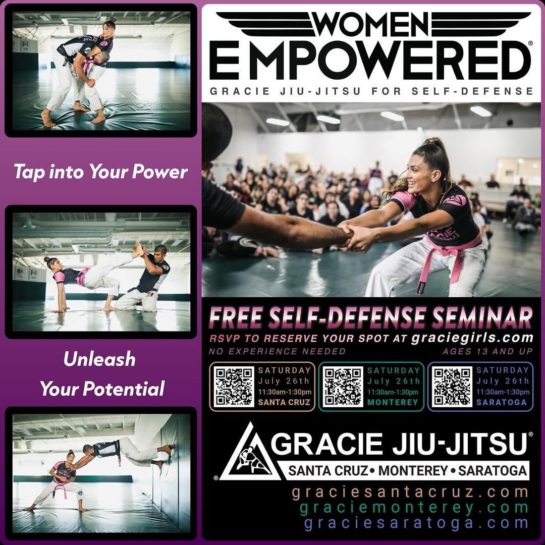 Gracie Jiu-Jitsu Monterey is offering a free Women's Self-Defense Seminar on Saturday, July 26, 11:30am-1:30pm. You'll go over life-saving techniques from the world-renowned art of Gracie Jiu-Jitsu in a fun, safe environment.