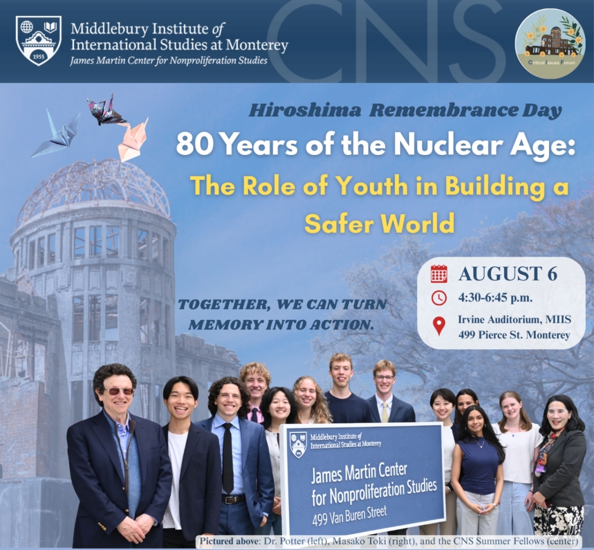 In honor of Hiroshima Remembrance Day, the James Martin Center for Nonproliferation Studies at MIIS presents 80 Years of the Nuclear Age: The Role of Youth in Building a Safer World on Wednesday, August 6, 4:30pm-6:45pm at Irvine Auditorium. This event is free and open to the public.