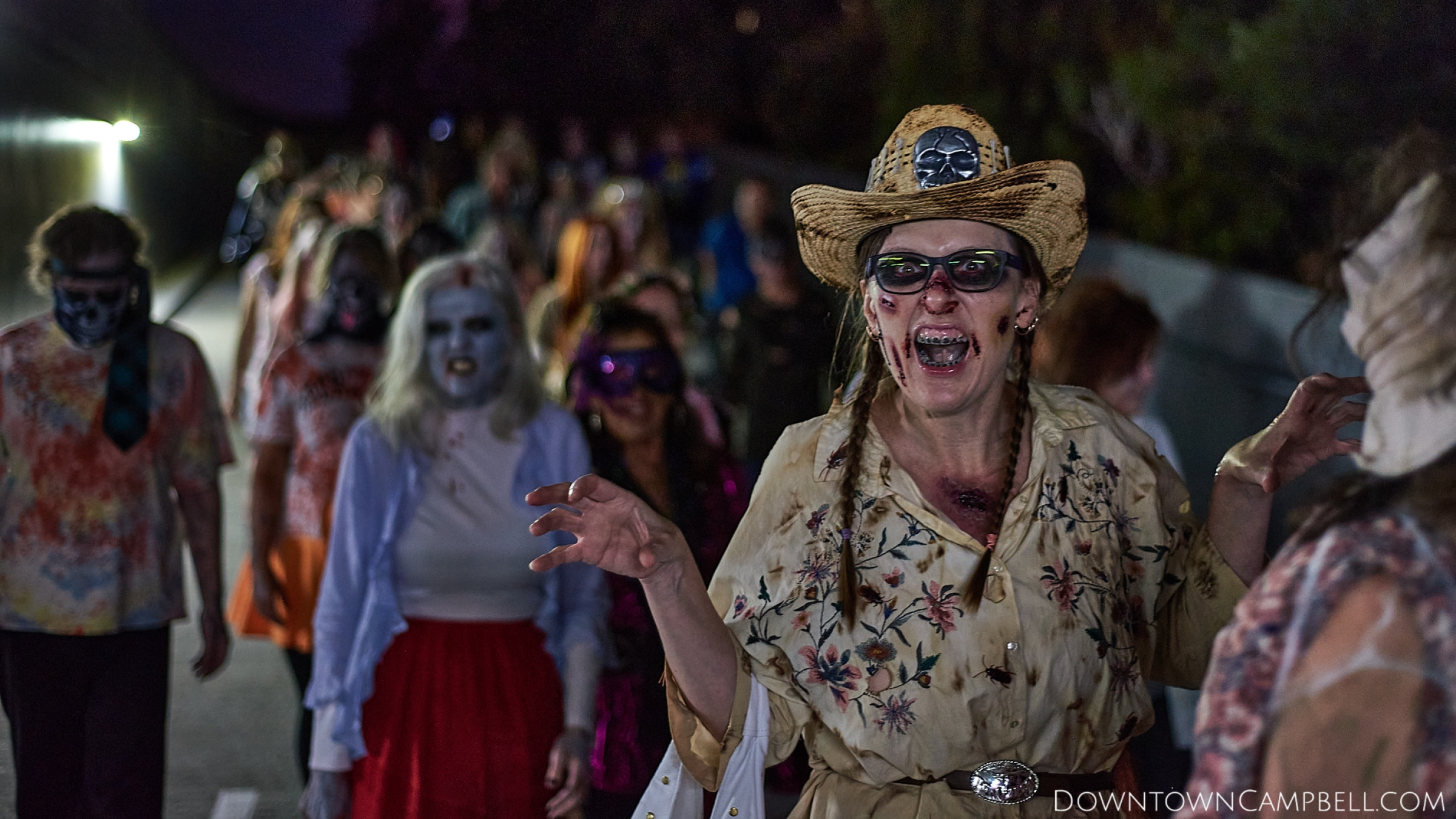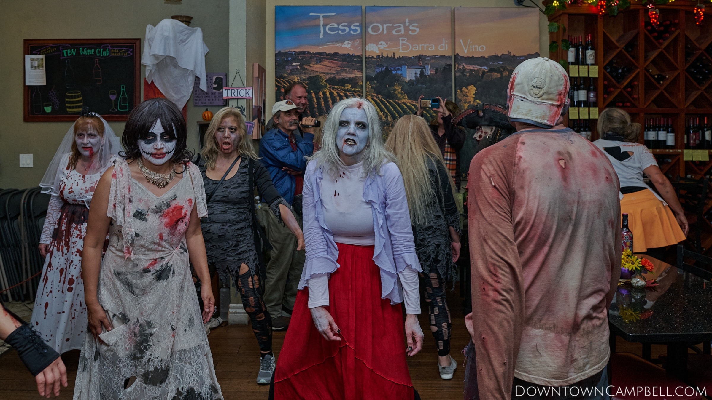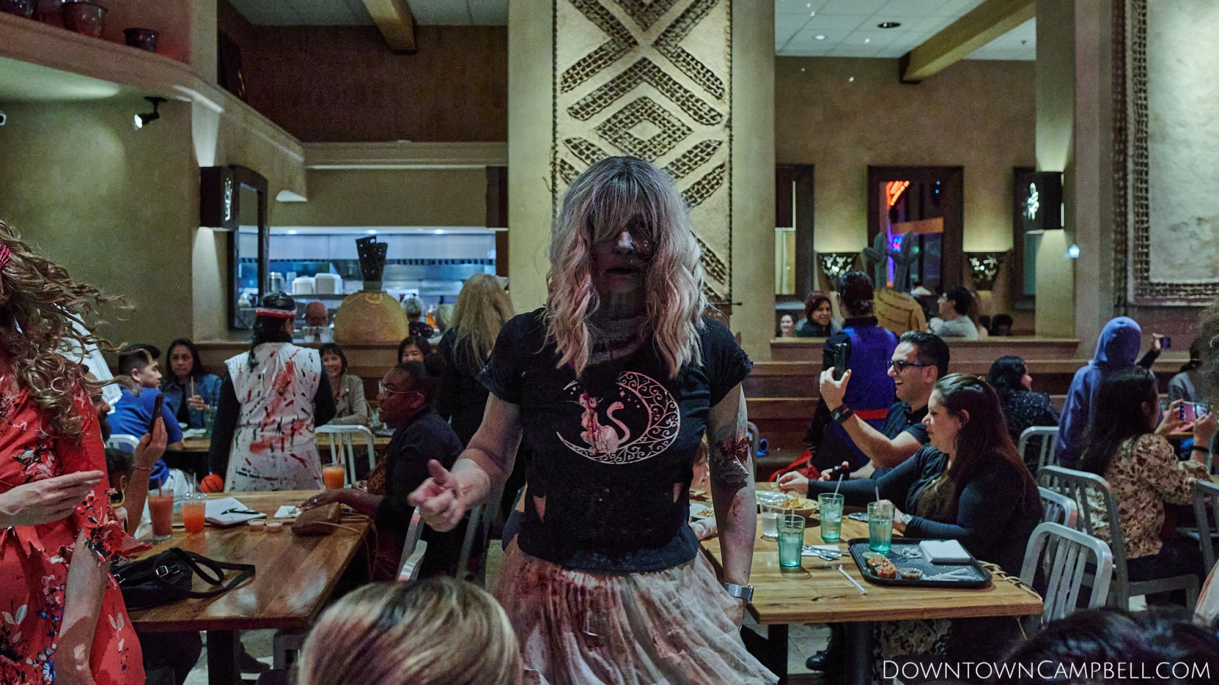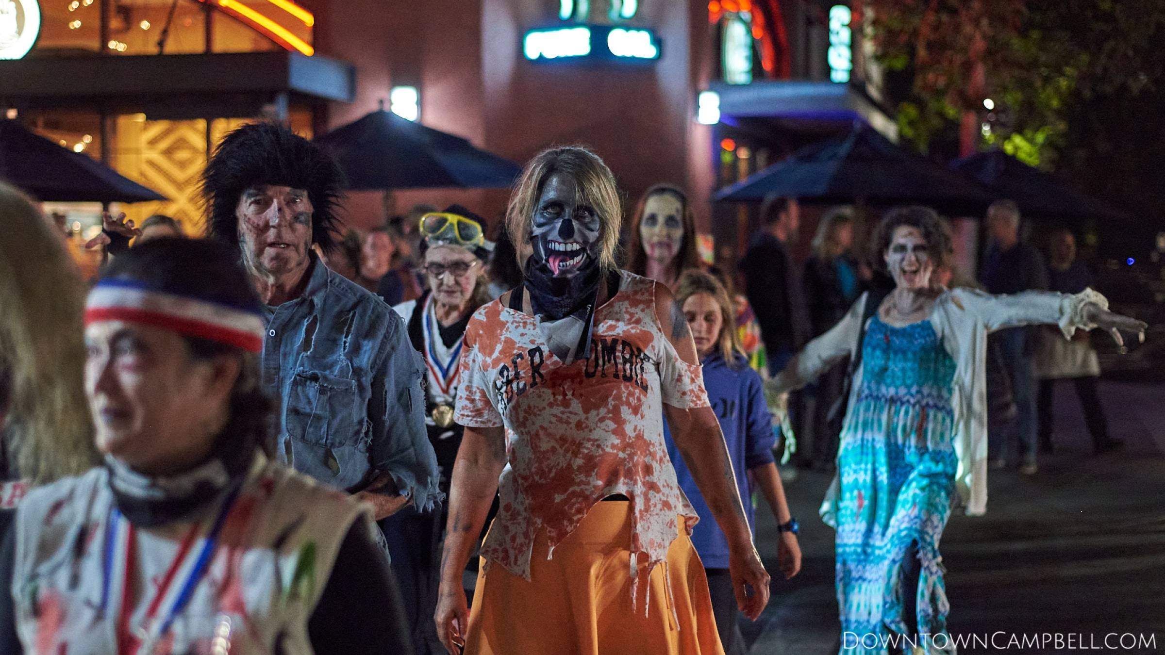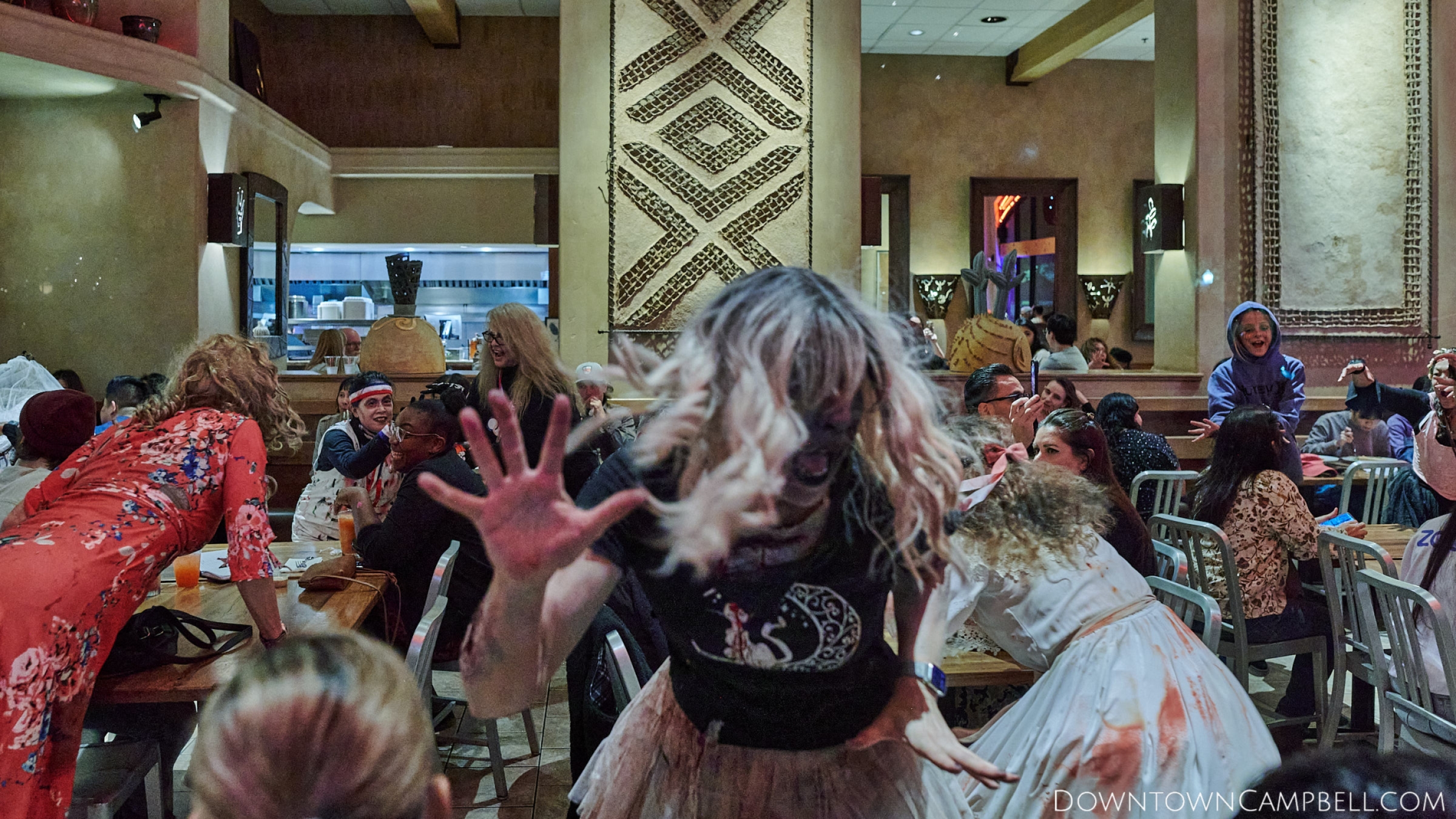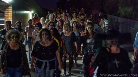 The terror begins at 7pm at Mo's and Willard Hick's Grill. It takes about 10 minutes for the zombies to get to each stop so if you want a front row seat, pick your favorite restaurant in Downtown Campbell and make reservations accordingly. The zombies will travel counterclockwise in a circuit around Downtown Campbell and finish the night at approximately 9pm at El Guapo's.