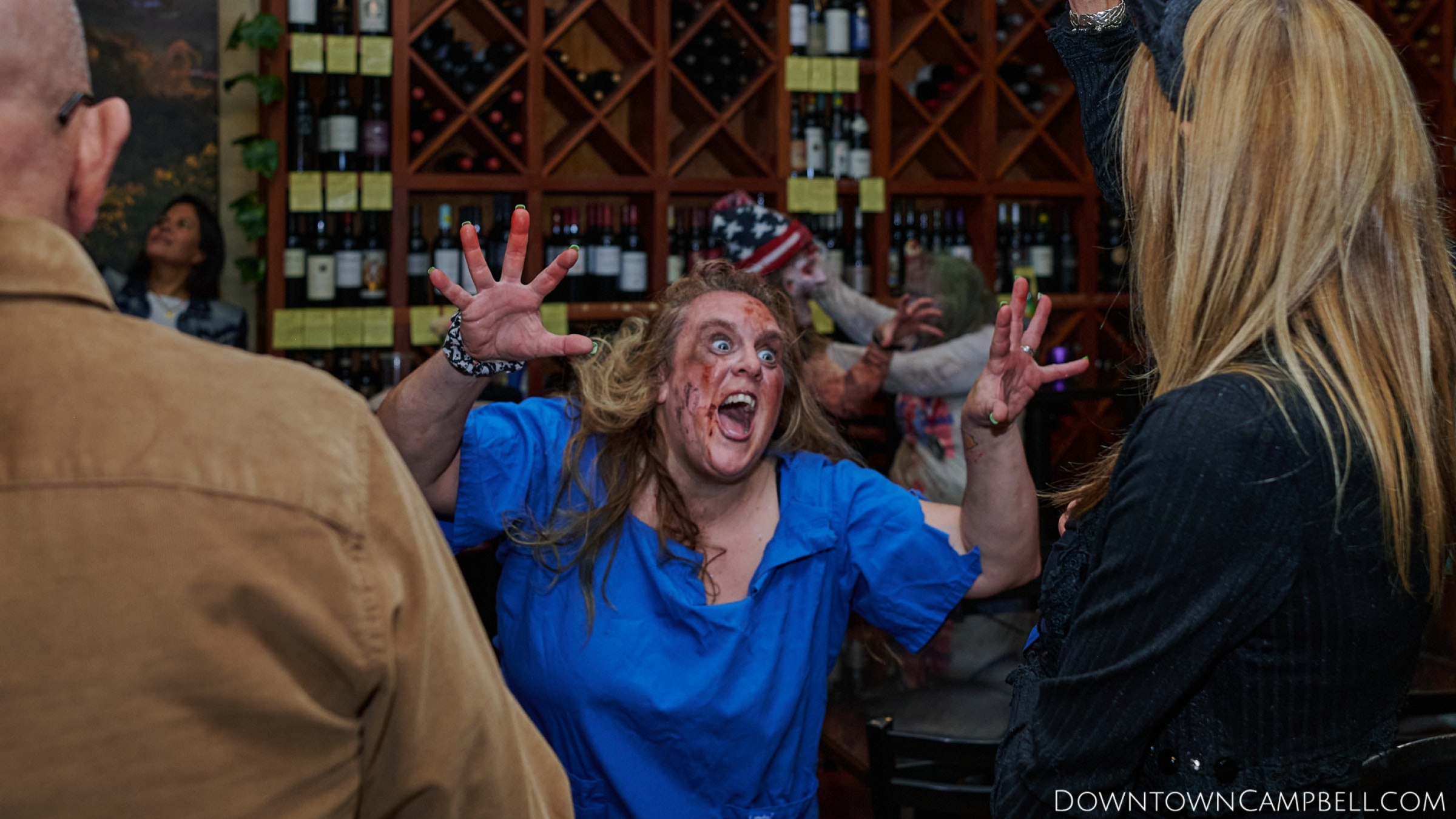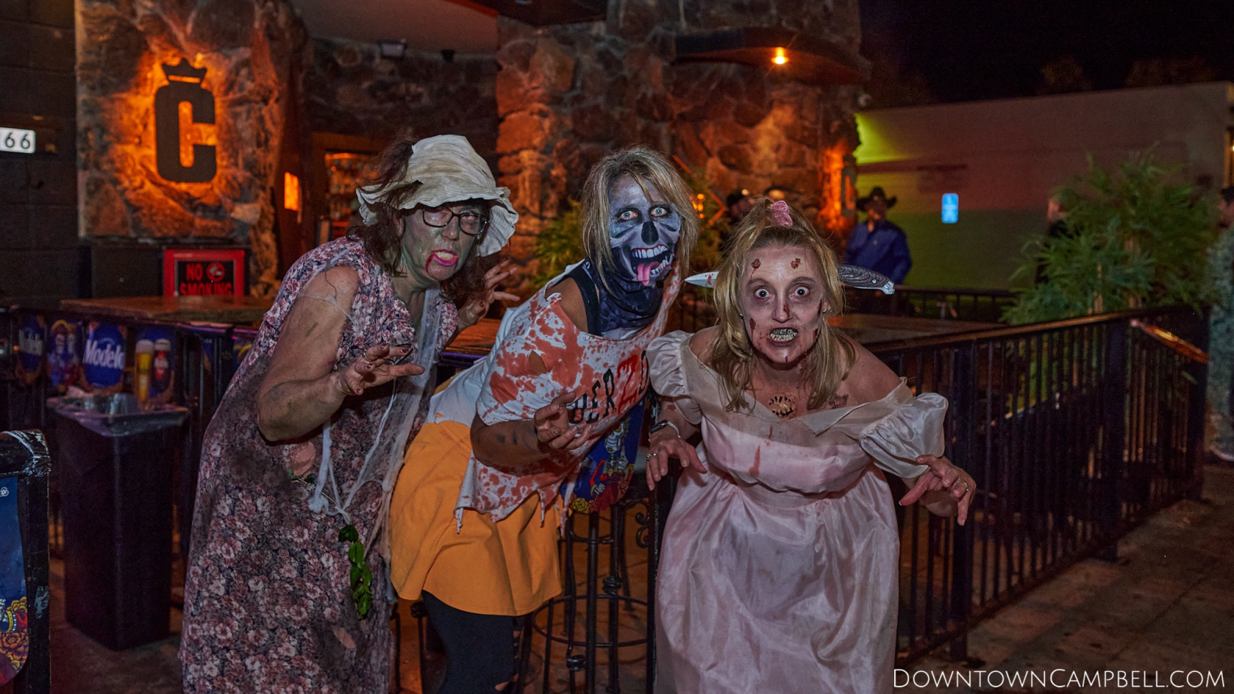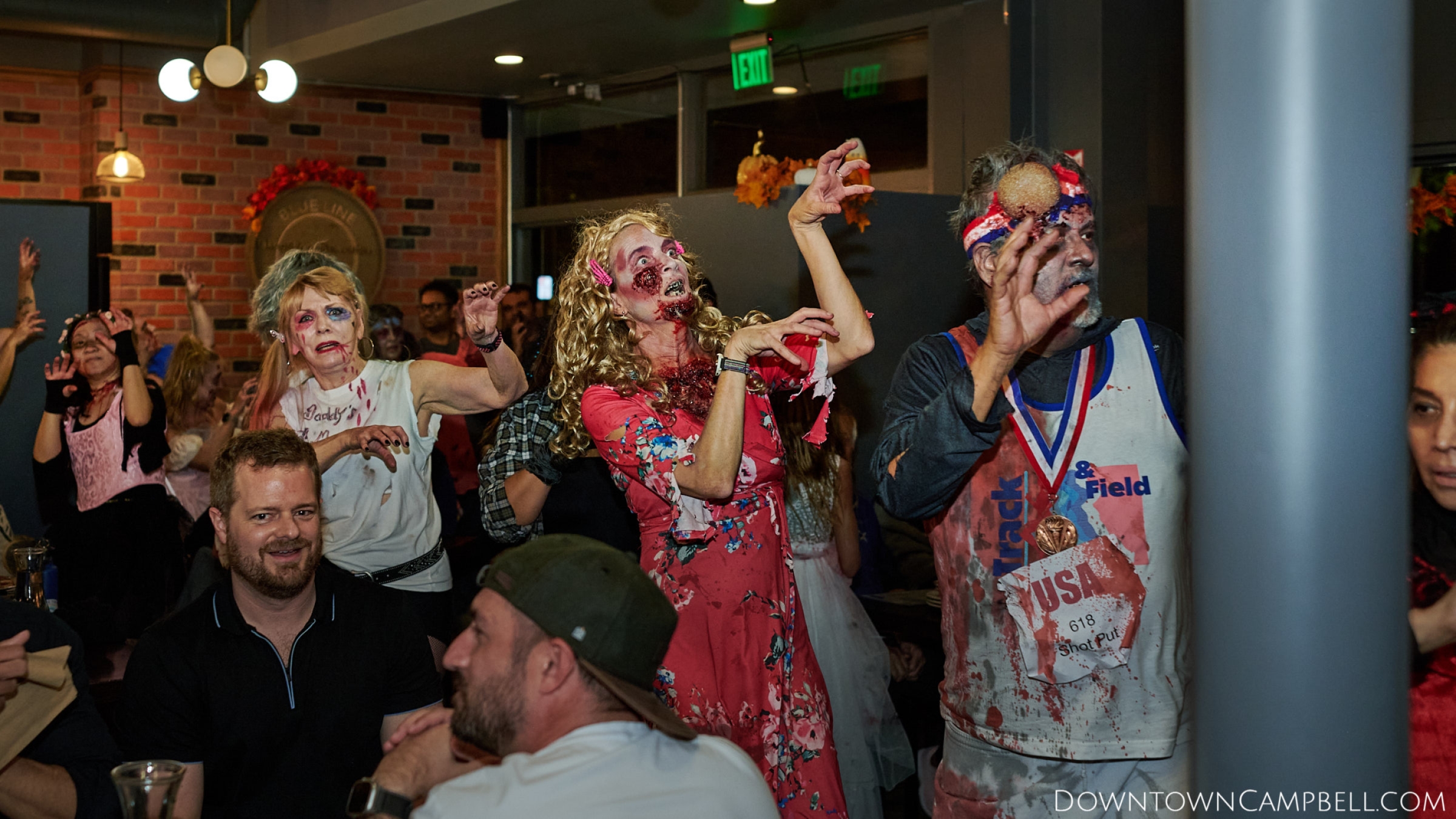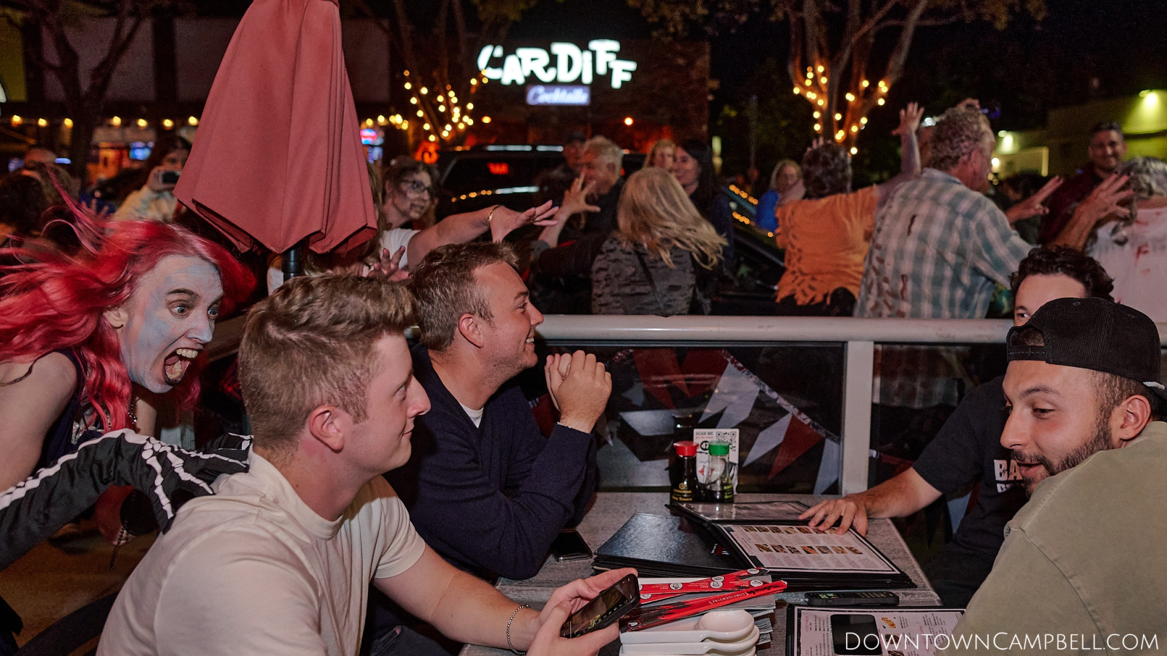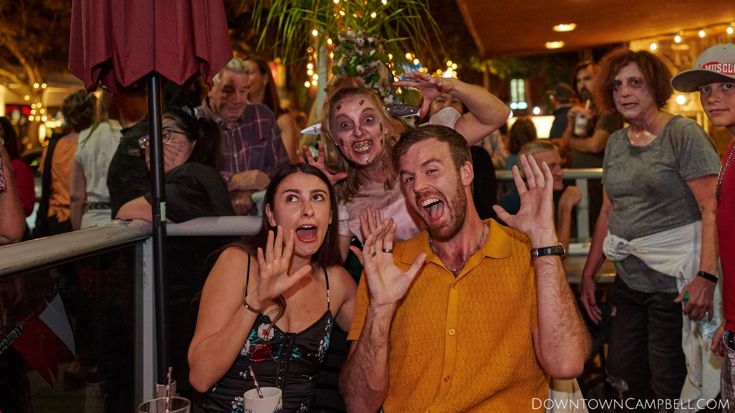 The terror begins at 7pm at Mo's and Willard Hick's Grill. It takes about 10 minutes for the zombies to get to each stop so if you want a front row seat, pick your favorite restaurant in Downtown Campbell and make reservations accordingly. The zombies will travel counterclockwise in a circuit around Downtown Campbell and finish the night at approximately 9pm at El Guapo's.