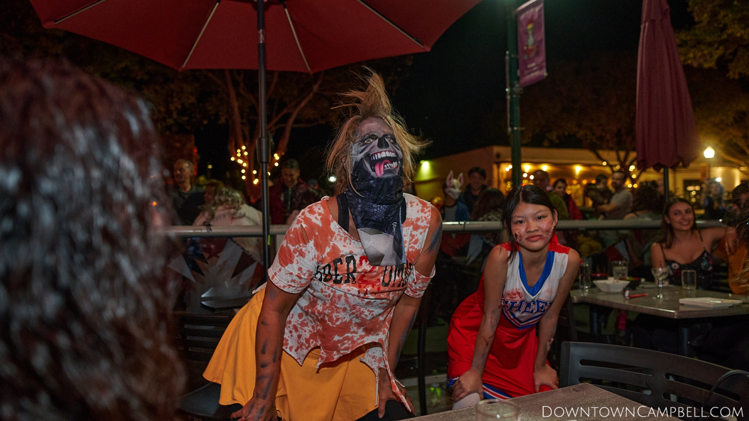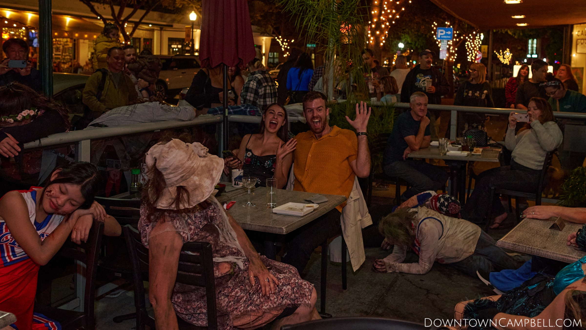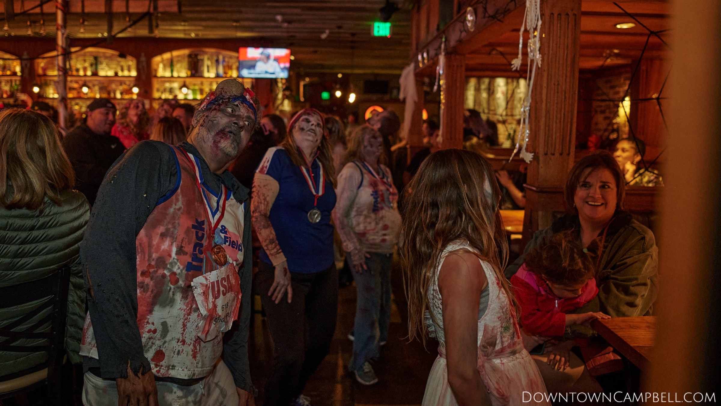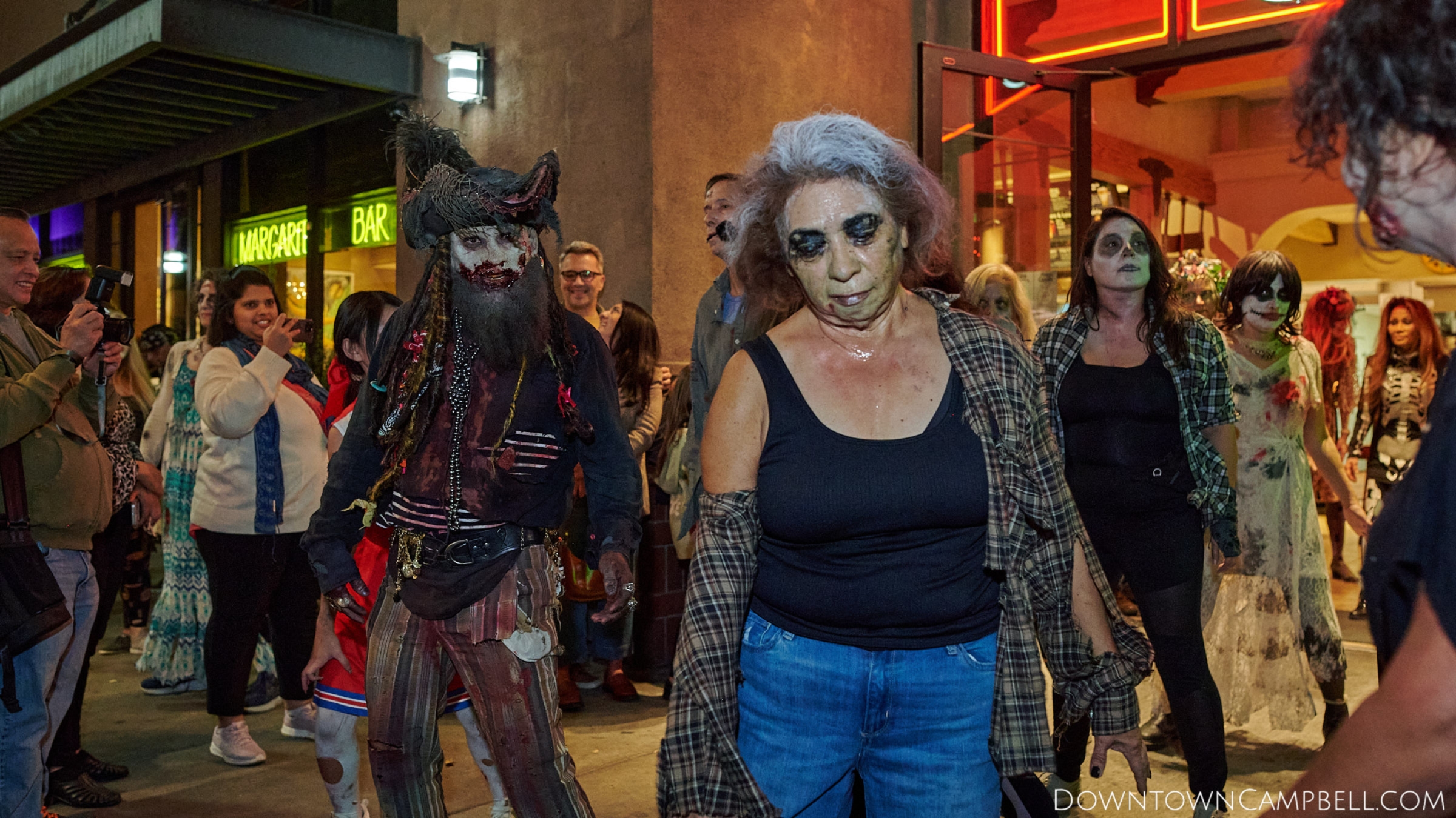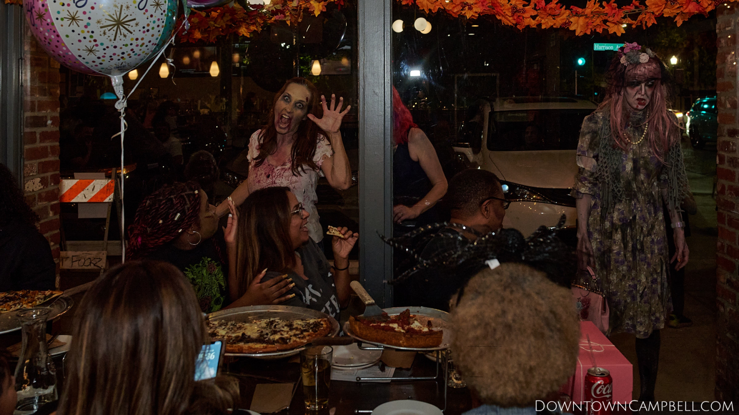 The terror begins at 7pm at Mo's and Willard Hick's Grill. It takes about 10 minutes for the zombies to get to each stop so if you want a front row seat, pick your favorite restaurant in Downtown Campbell and make reservations accordingly. The zombies will travel counterclockwise in a circuit around Downtown Campbell and finish the night at approximately 9pm at El Guapo's.