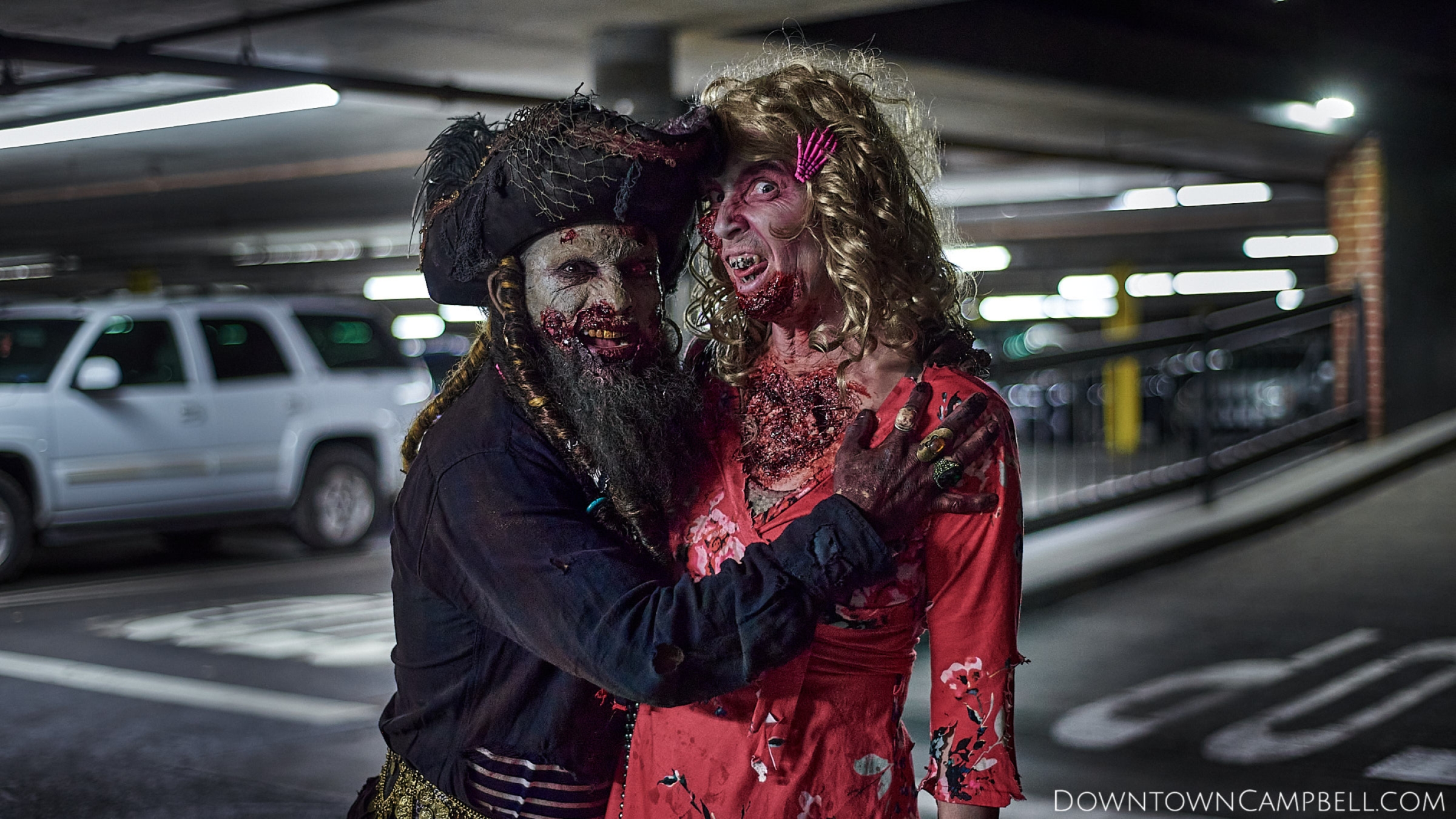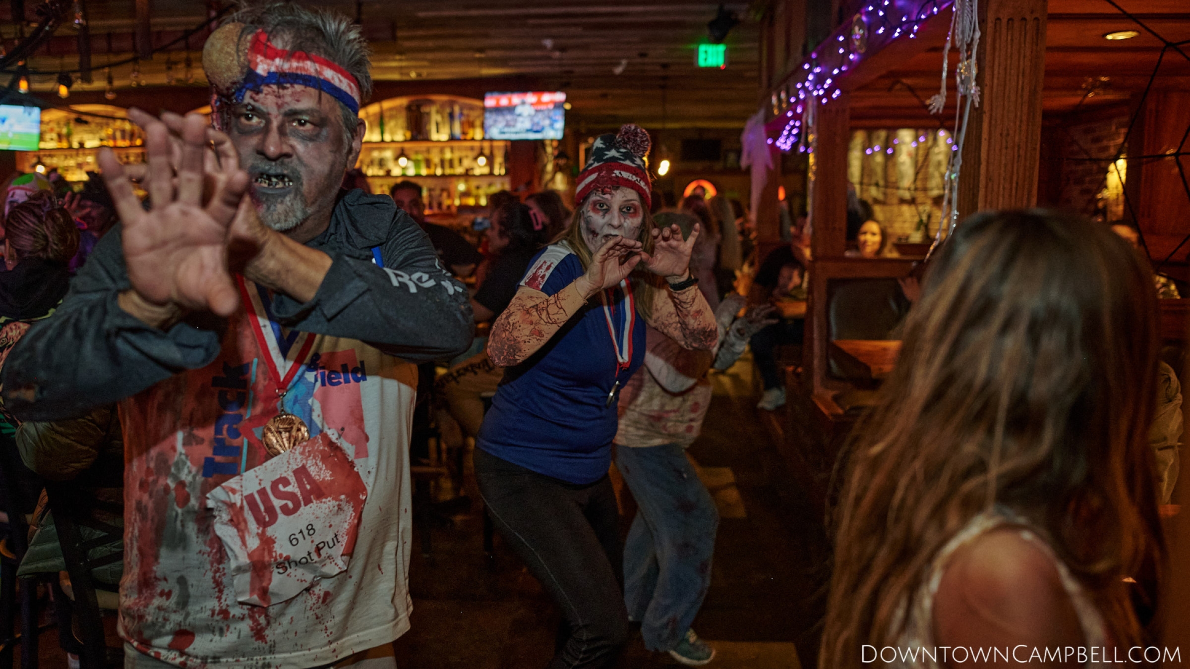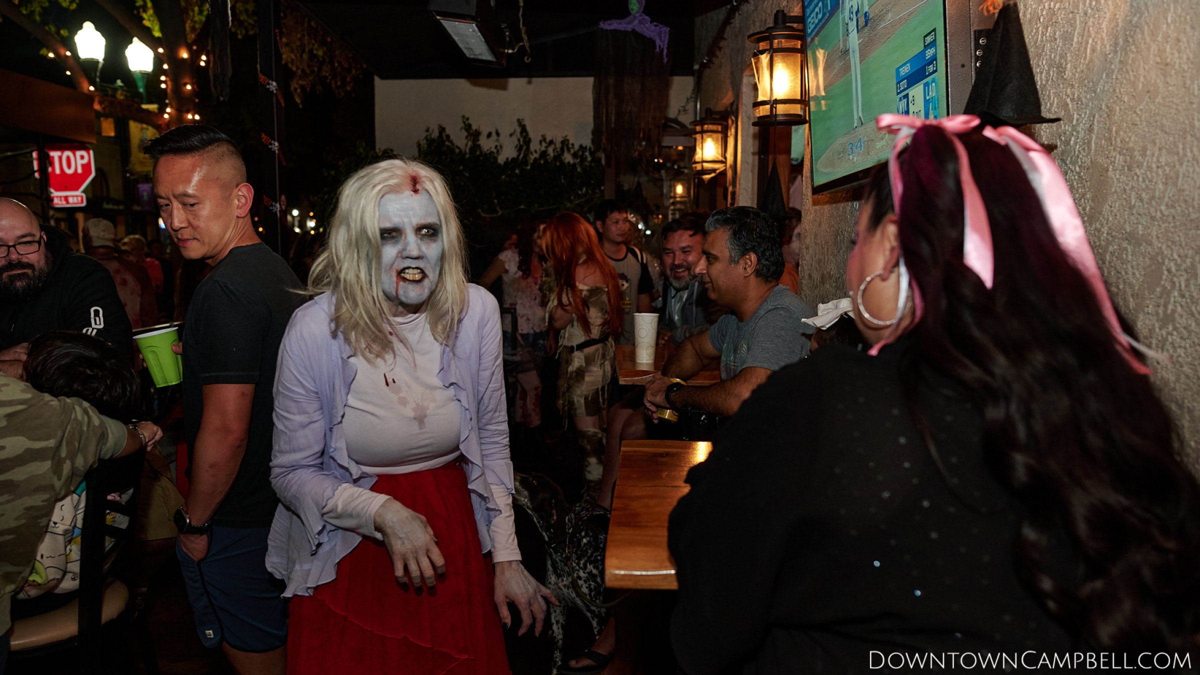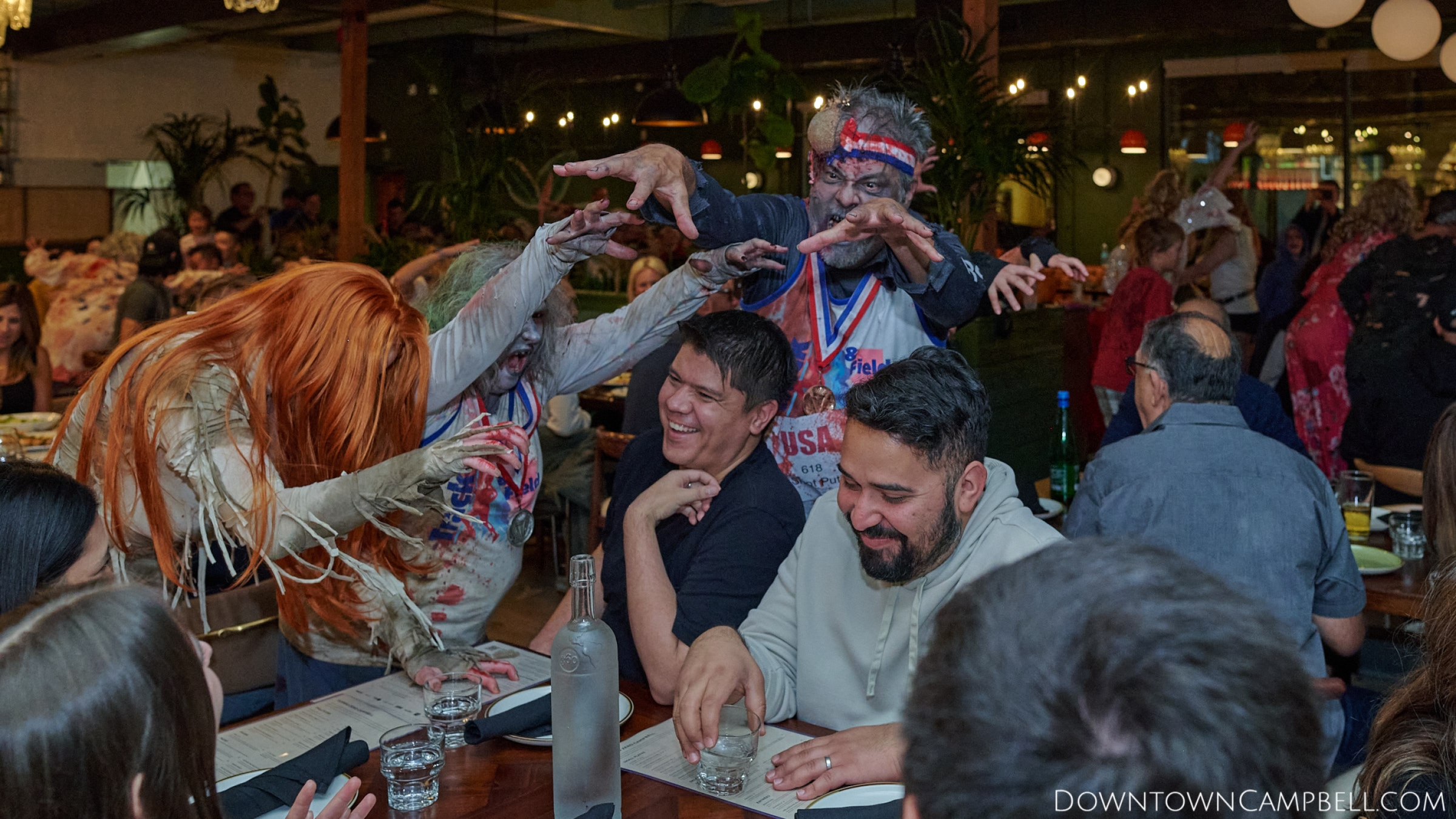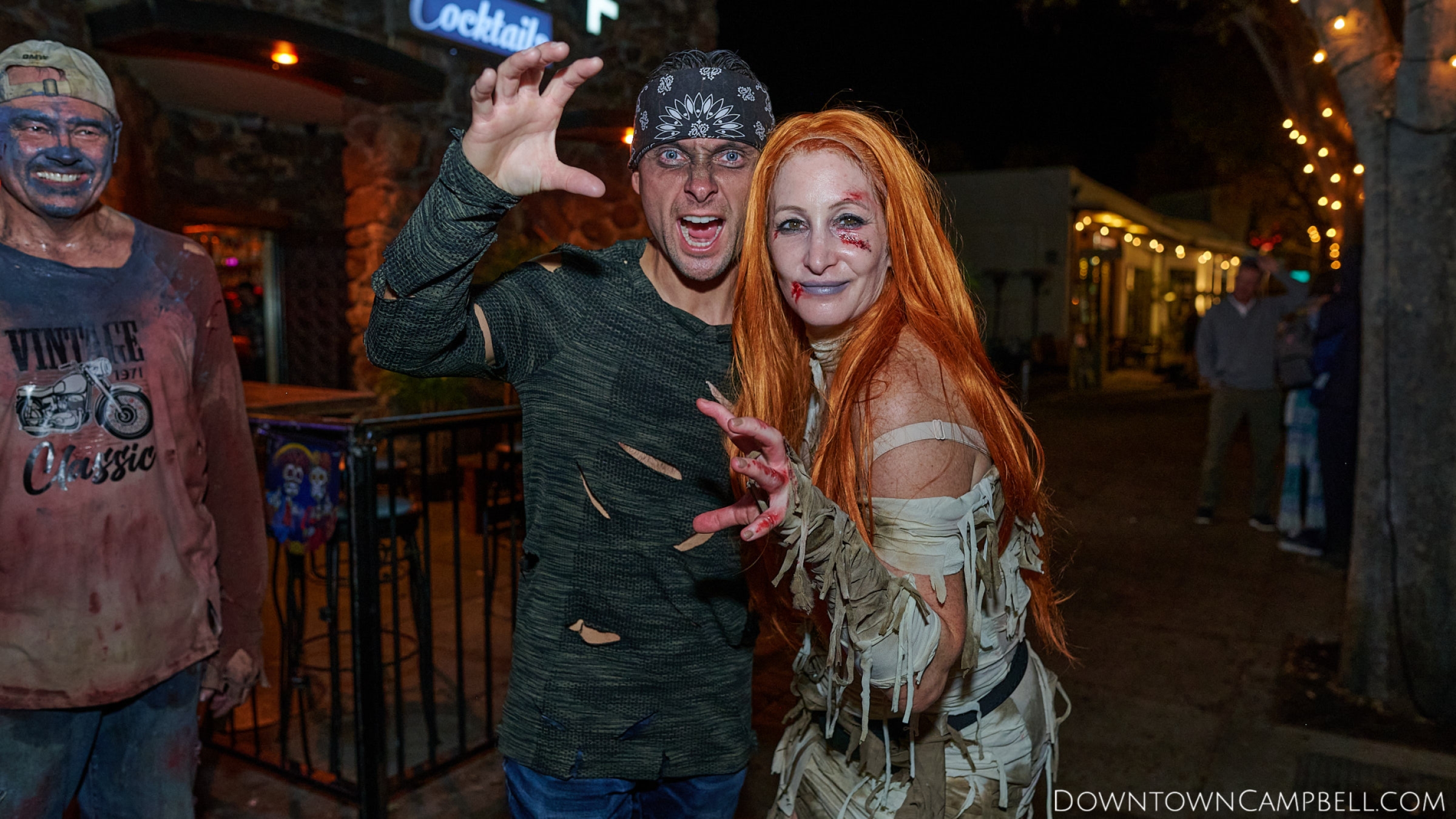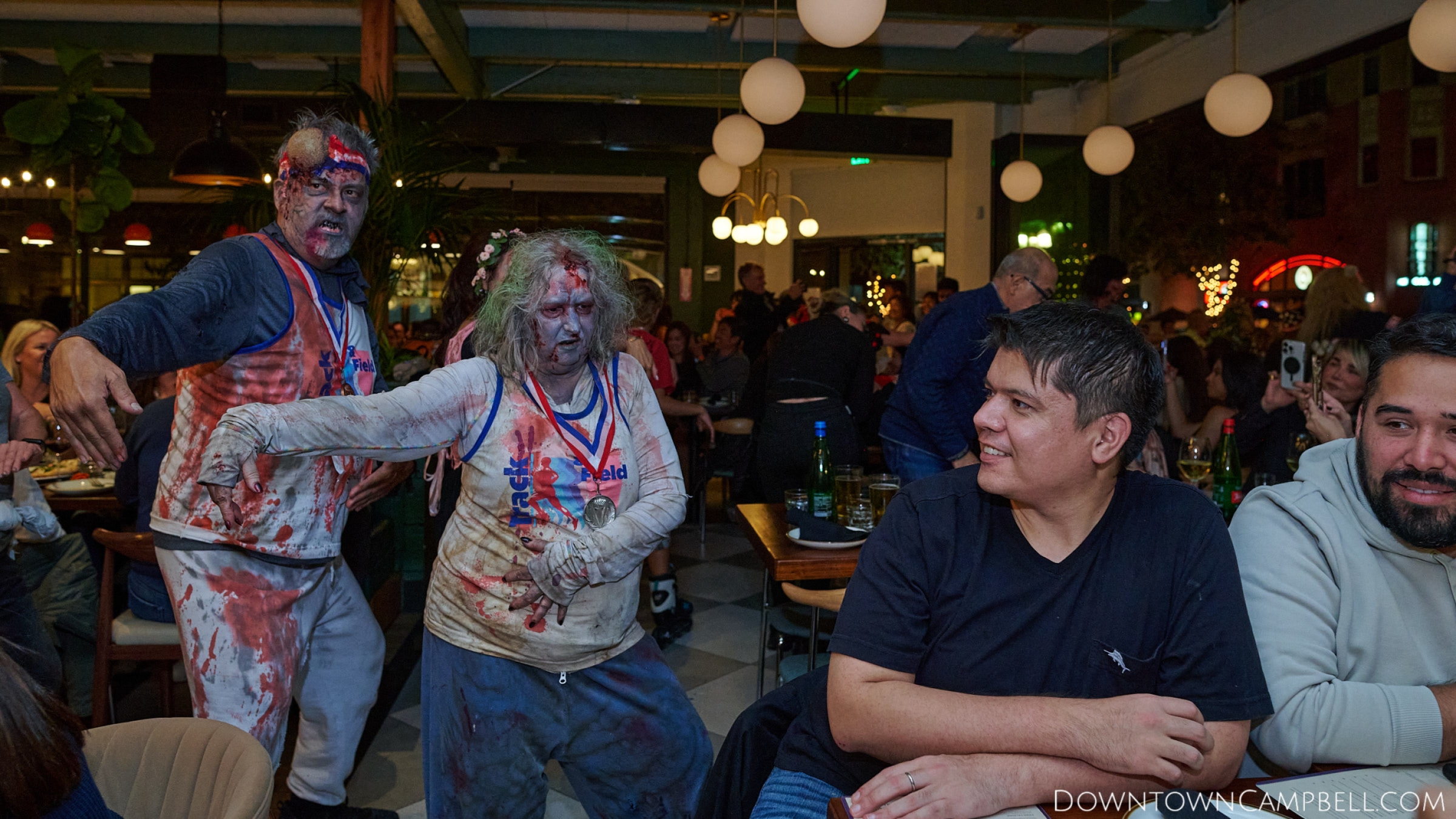 The terror begins at 7pm at Mo's and Willard Hick's Grill. It takes about 10 minutes for the zombies to get to each stop so if you want a front row seat, pick your favorite restaurant in Downtown Campbell and make reservations accordingly. The zombies will travel counterclockwise in a circuit around Downtown Campbell and finish the night at approximately 9pm at El Guapo's.