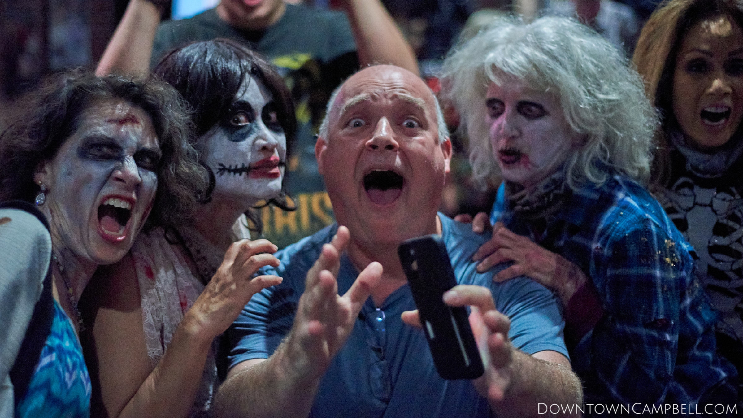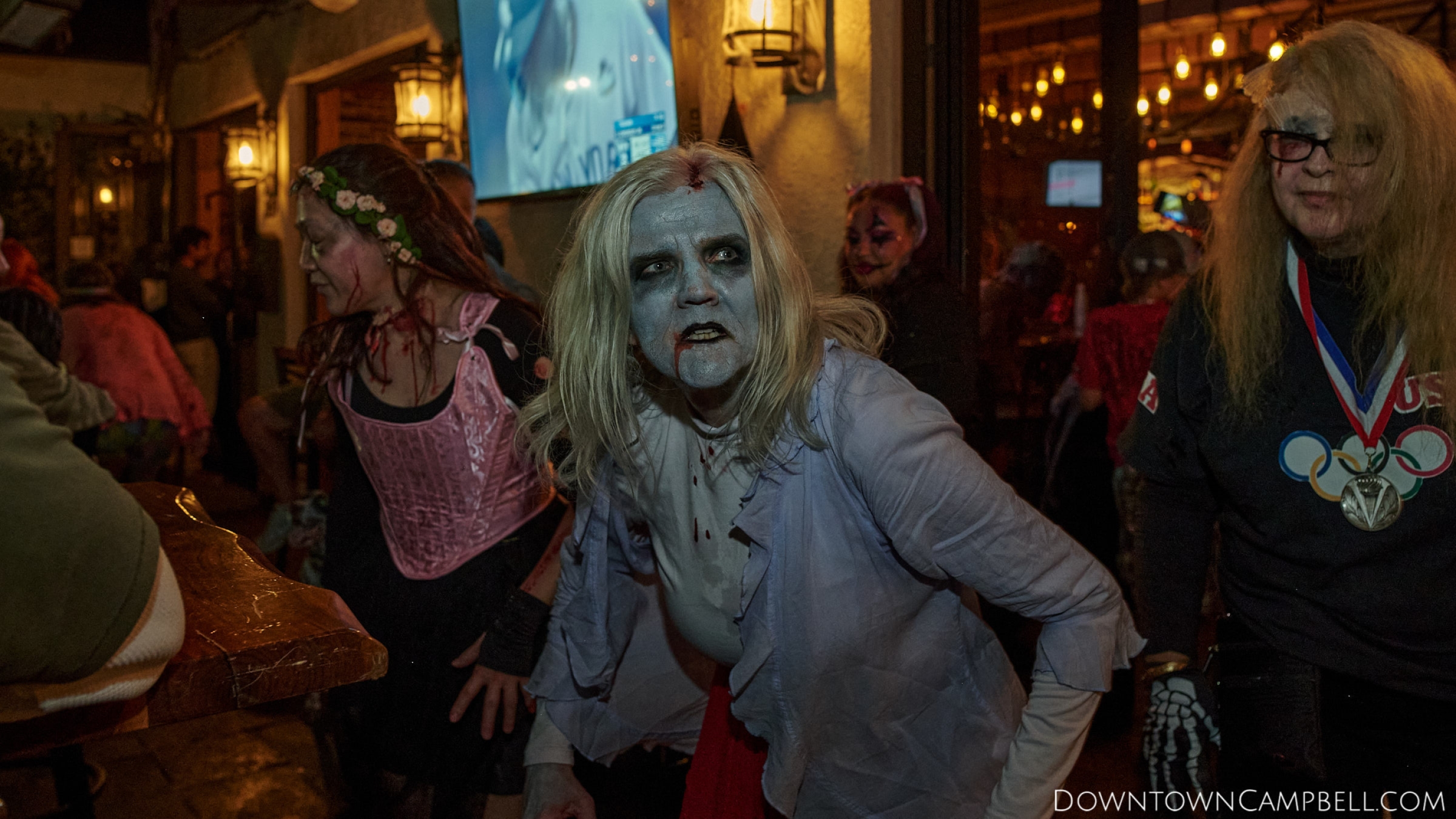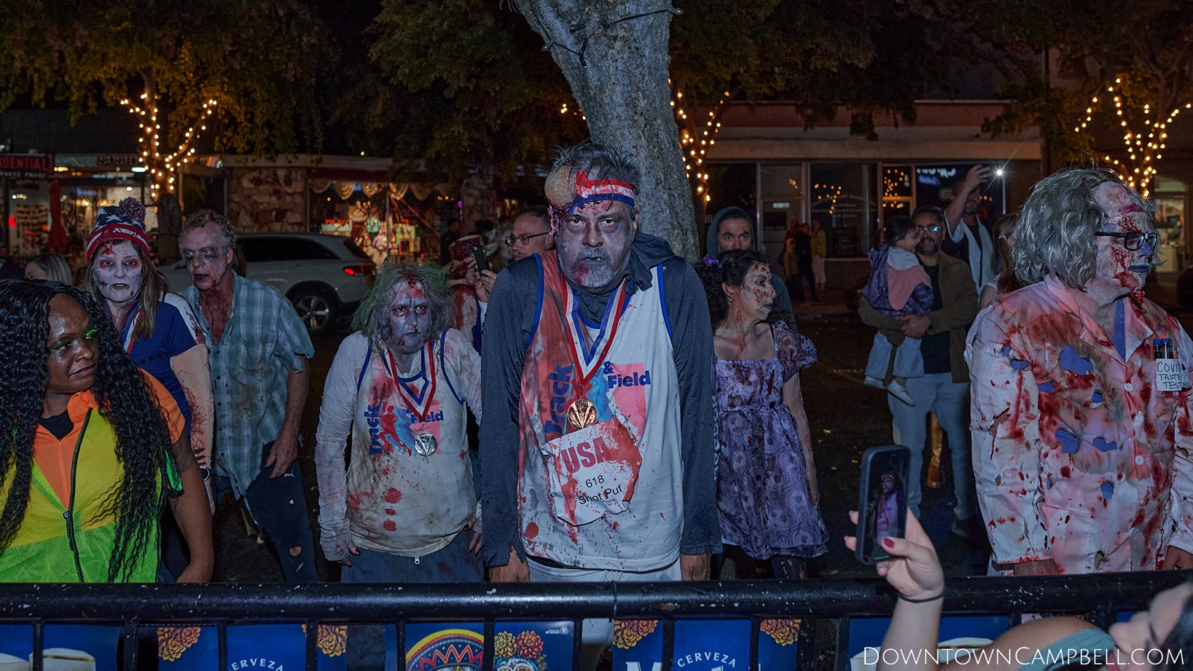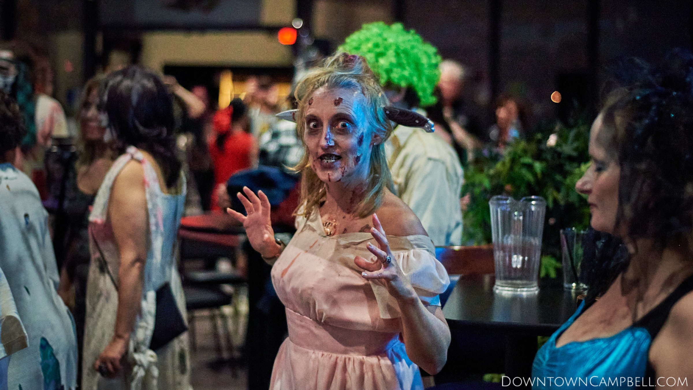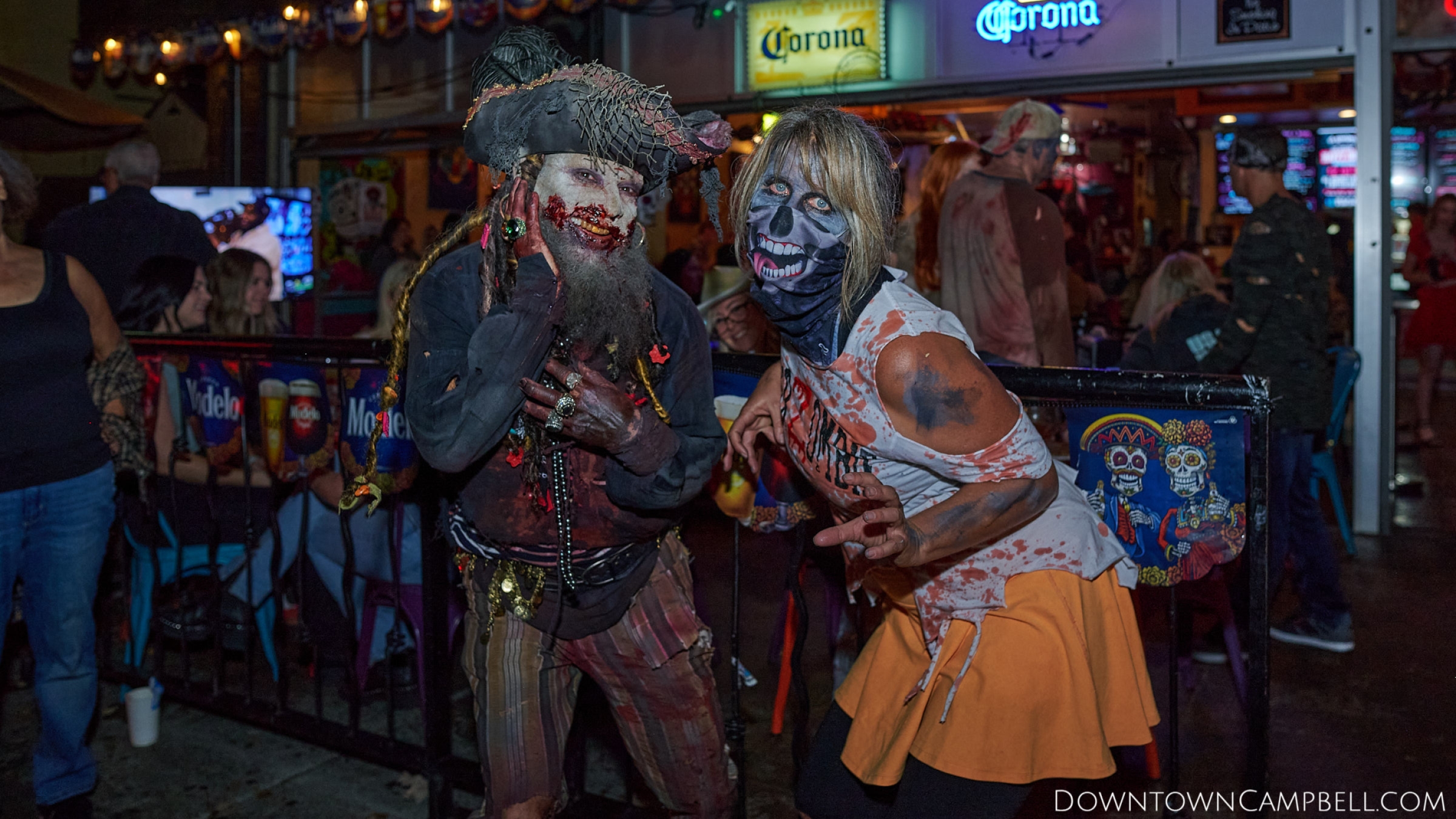The terror begins at 7pm at Mo's and Willard Hick's Grill. It takes about 10 minutes for the zombies to get to each stop so if you want a front row seat, pick your favorite restaurant in Downtown Campbell and make reservations accordingly. The zombies will travel counterclockwise in a circuit around Downtown Campbell and finish the night at approximately 9pm at El Guapo's.
