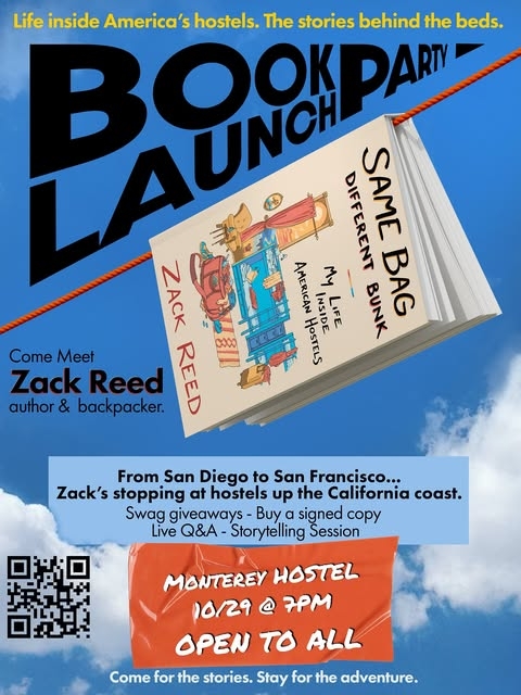 Monterey Hostel hosts author Zack Reed on Wednesday, October 29, 7pm-8pm, as we celebrate the release of his new travel memoir, Same Bag, Different Bunk: My Life Inside American Hostels. The event is free and open to all ages!