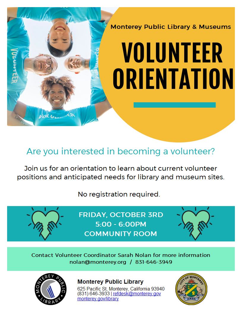 Are you interested in volunteering for Monterey Public Library or the museums? Come learn more! We're holding an orientation / information session on Friday, October 3, 5pm-6pm in the Community Room of Monterey Public Library. No registration is required.