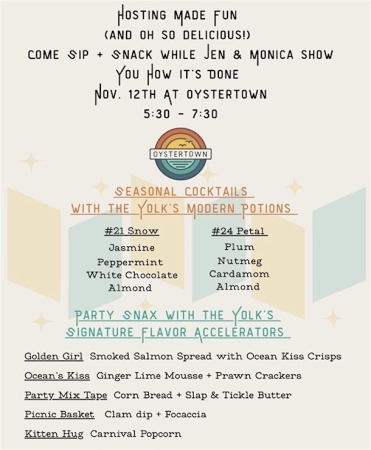 Oystertown and The Yolk Marketplace host How to Throw a Holiday House Party, a festive workshop on Wednesday, November 12, 5:30pm-7:30pm.
