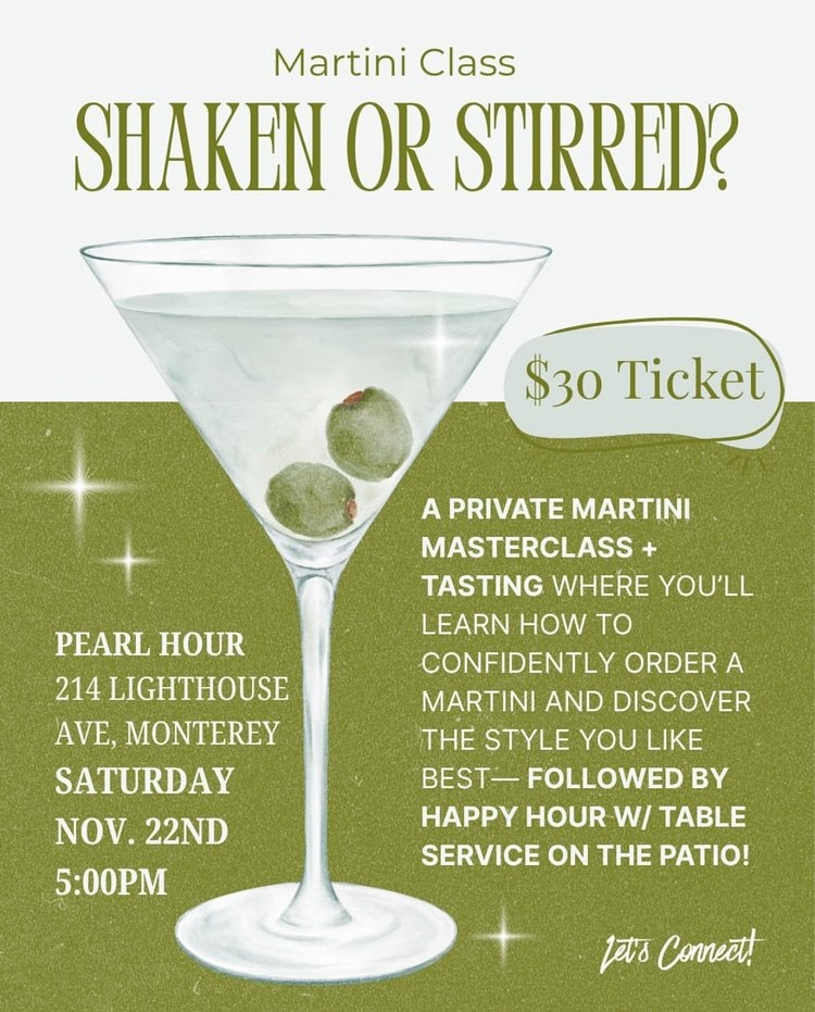 Pearl Hour cocktail bar and Coastal Connect Monterey present Shaken or Stirred?, a private martini masterclass and tasting on Saturday, November 22 at 5pm. Ages 21+ only.