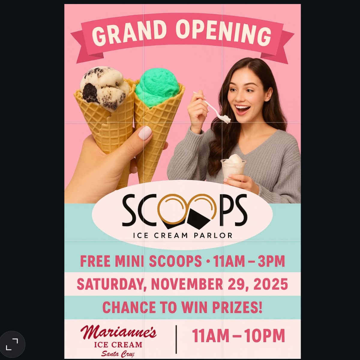 Scoops Ice Cream Parlor is celebrating our Grand Opening on Small Business Saturday, November 29, 11am-10pm. Come join us! Locally owned and operated, we're proud to serve Marianne's Ice Cream.
